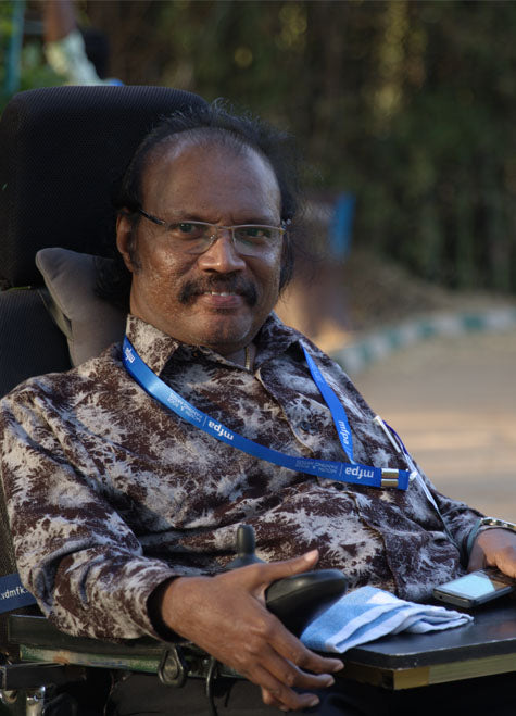M. V. Ravindran was born in Payyanur, Kerala on 1 March 1969. At the tender age of two, he fell ill with polio which left both his legs and hands paralysed. He was not able to cope with school and had to drop out eventually. Painting was one of the few things that gave him joy and so he met and visited a well-known mouth painter who lived closeby. Under his guidance, he began painting with his mouth. He practised incessantly until he mastered the technique. Ravindran uses oil and acrylic paint for his paintings. His favourite themes include the landscapes of his homeland, flowers and people.