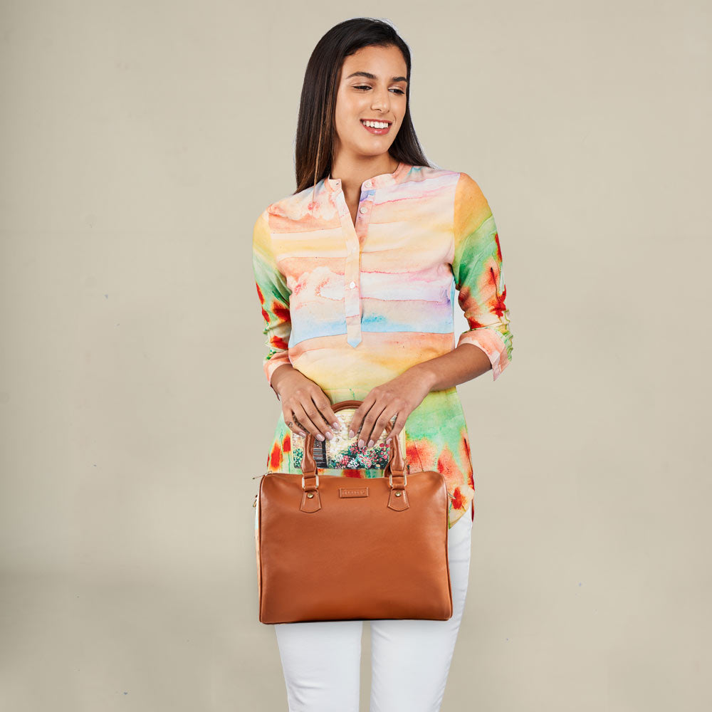 Welcome your day with a fresh, minimalist appeal and be the bright sky in the city. This bag comes with an ultra-modern, revitalising painting and a side-touch of tan colour. It is composed of Vegan leather that is completely/100% environment friendly and best to rock your everyday office look. Twin it up for a brunch, it’s spacious to house all your styles!