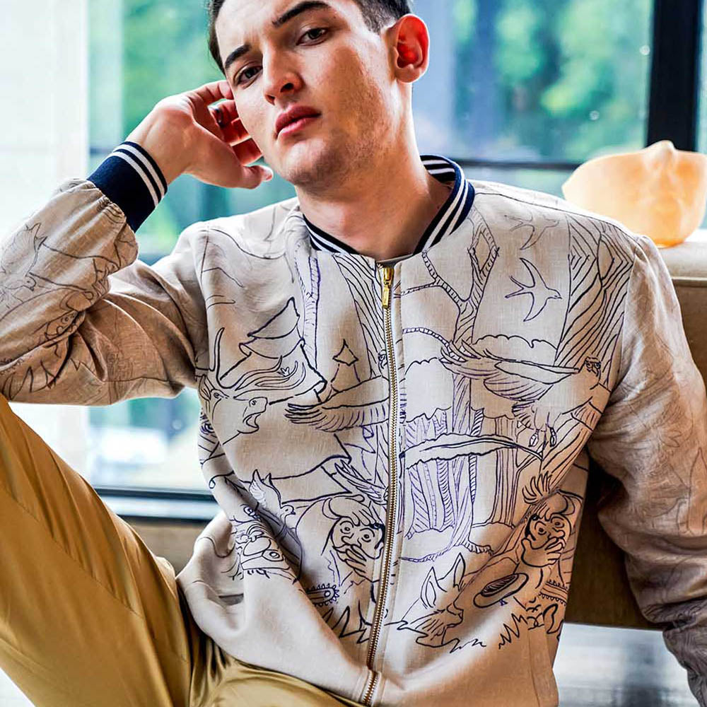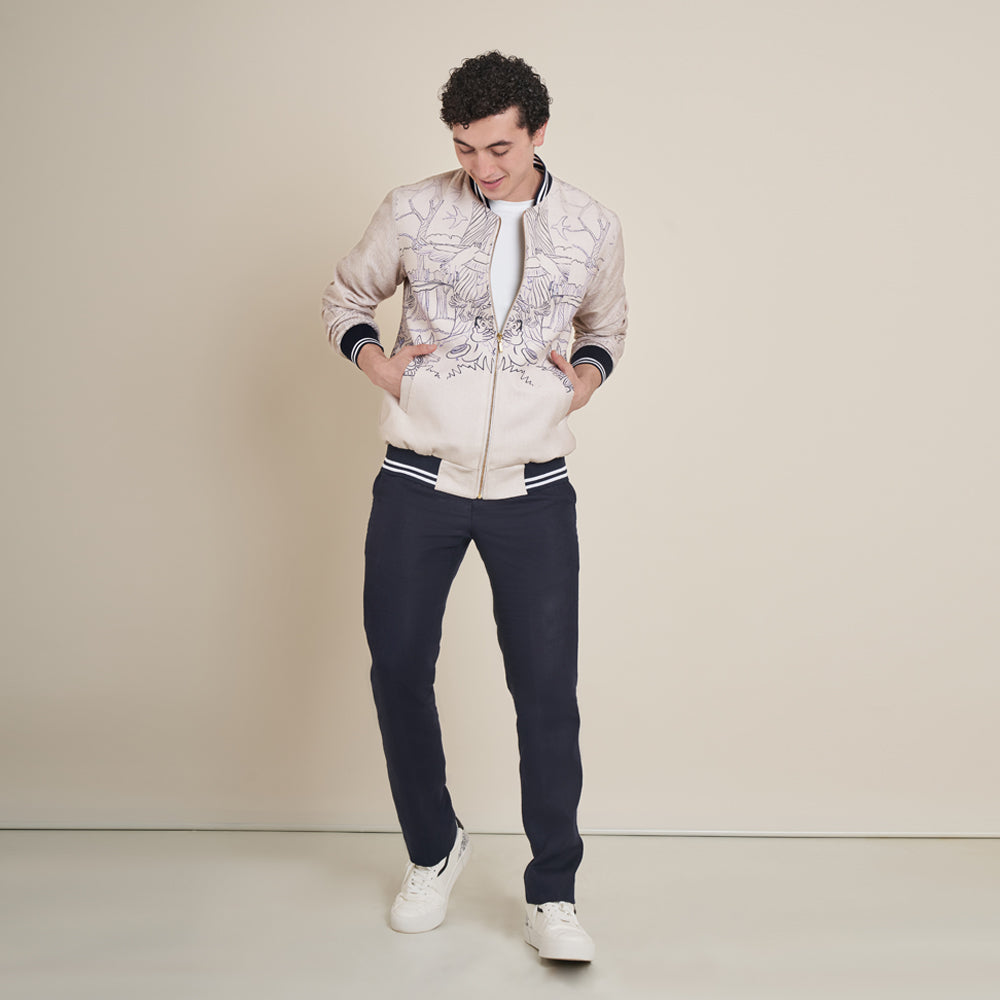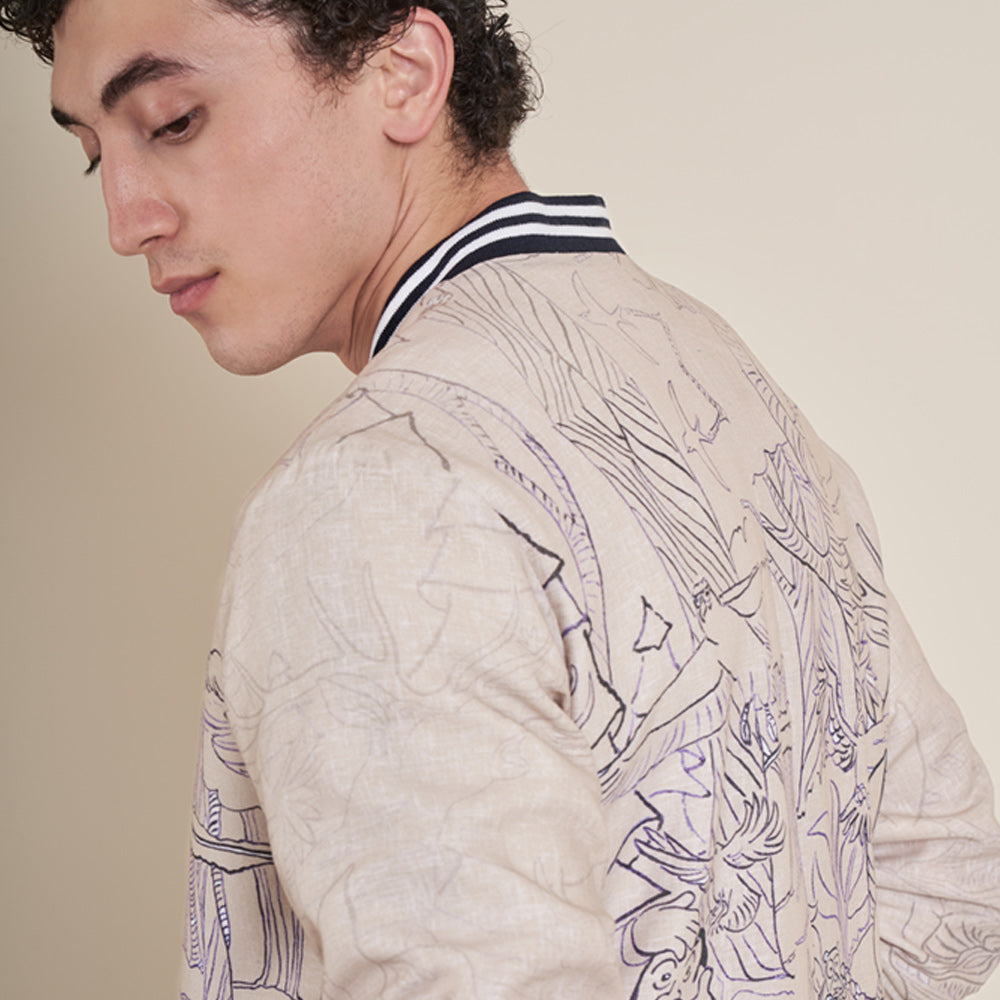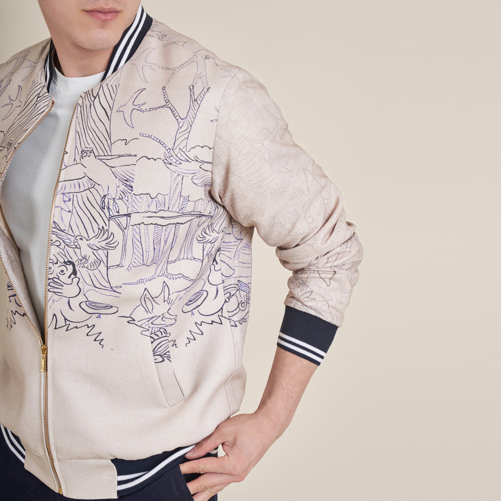Introducing our “La chasse au bûcheron” Beige Cotton Linen Regular Fit Bomber Jacket, a fashion essential that effortlessly blends art and style. This isn’t just a fashion statement; it’s a masterpiece of wearable art. Crafted with meticulous attention to detail, this regular-fit bomber jacket features the exquisite ‘The Woodcutter’s Hunt’ pencil line art, meticulously spread across the jacket. As a standalone piece, it embodies the essence of stylish sophistication, ensuring you shine as the party star. It’s more than just a jacket; it’s an artistic journey, a celebration of your unique style. Elevate your look, embrace the art of individuality, and make an unforgettable entrance with this exceptional masterpiece that effortlessly balances the perfect look, every time.