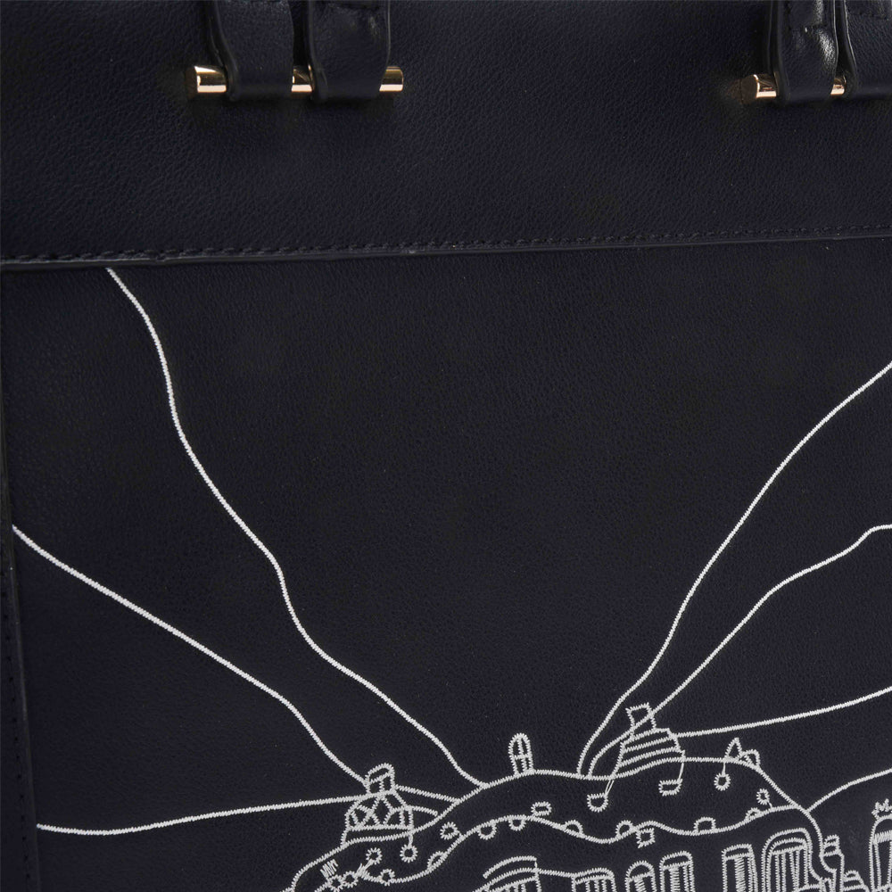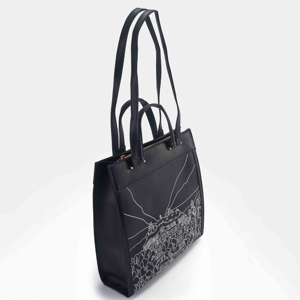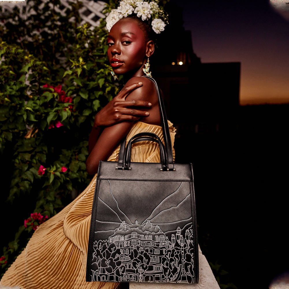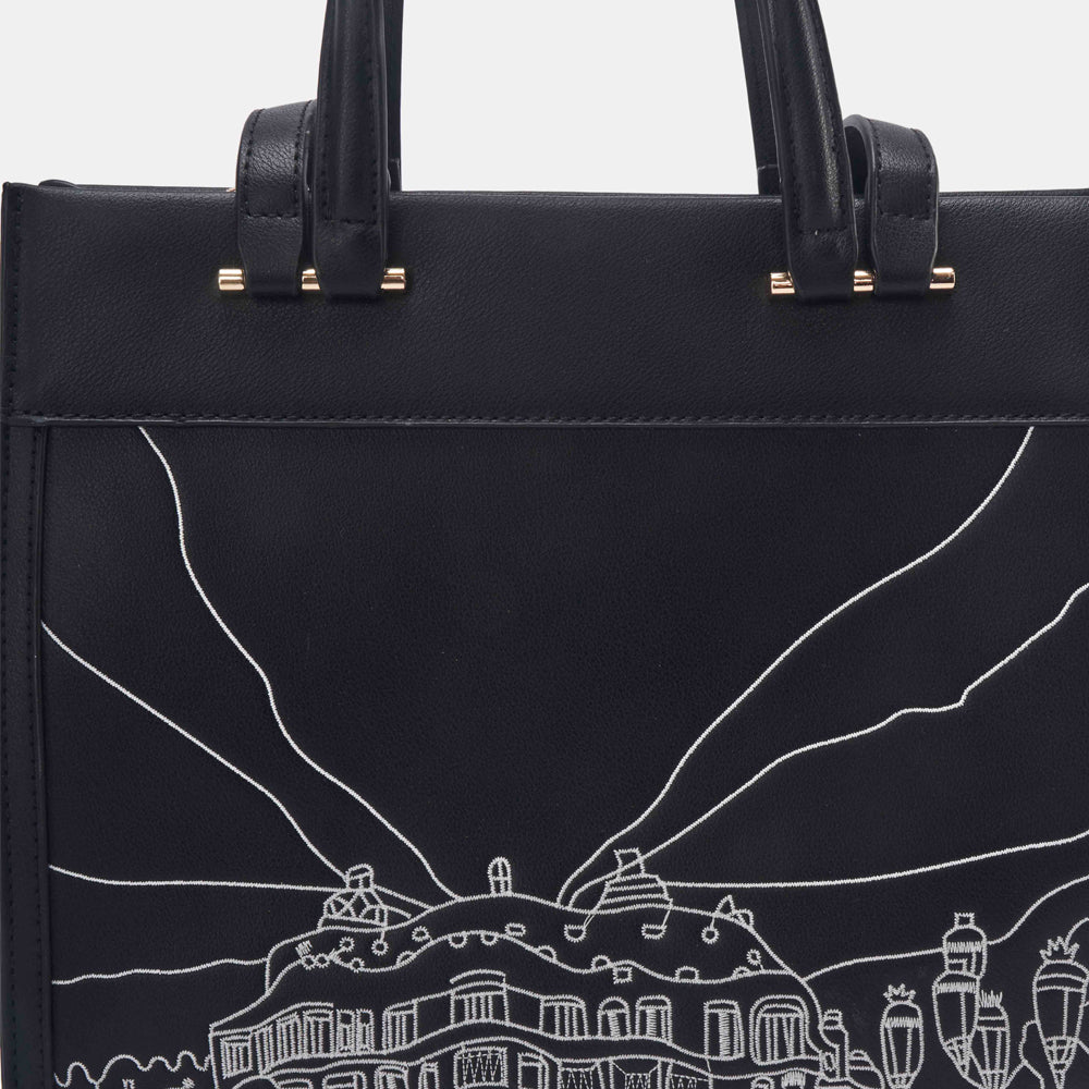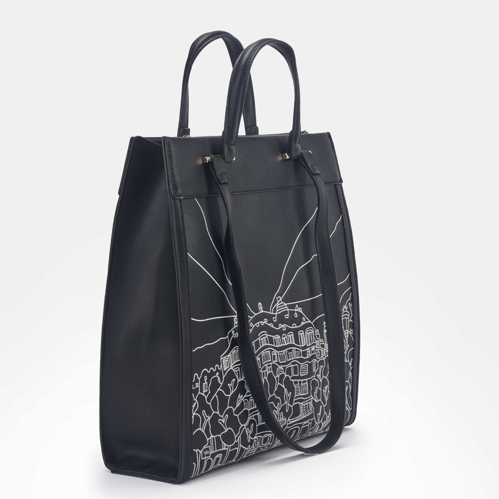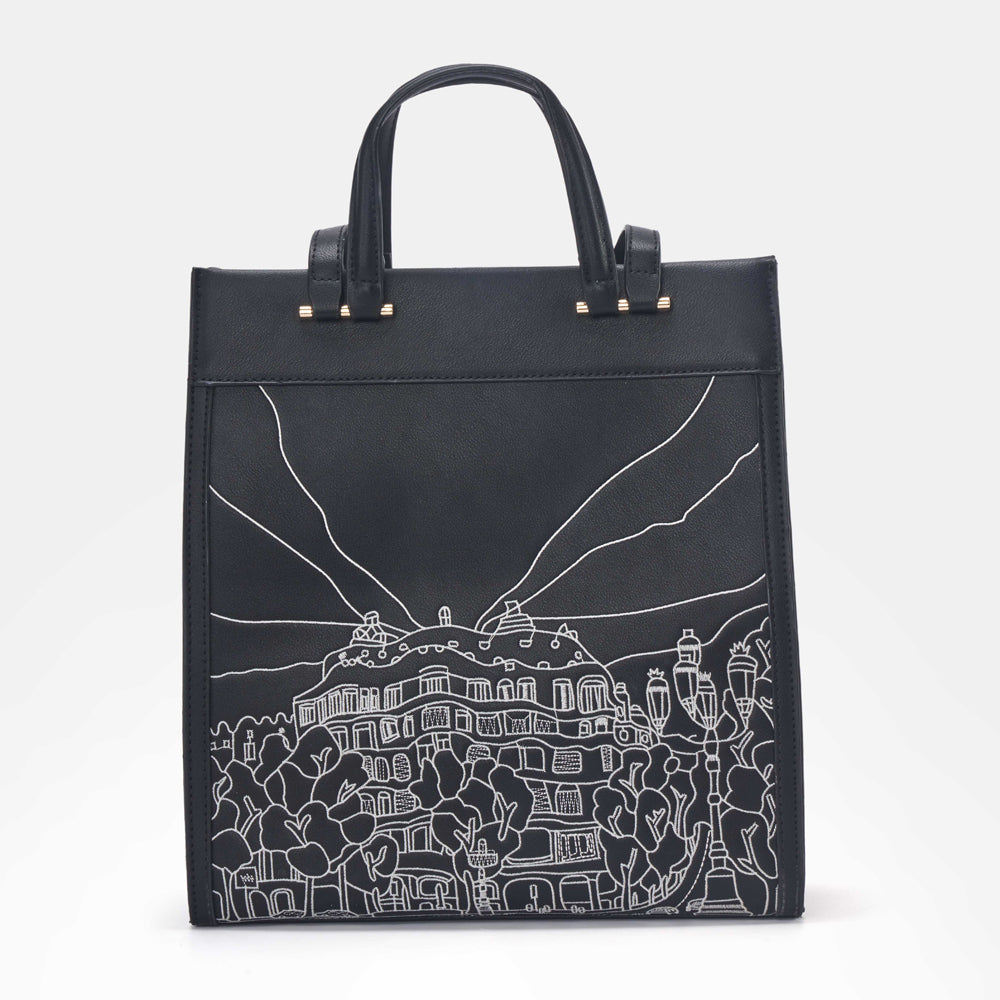 Introducing Casa Milà from the Élégante Glam Collection by Doué. This vertically long bag is designed to make a statement, featuring a double stylish handle for versatile carrying options—by hand or over the shoulder. The front of the bag showcases intricate thread embroidery in tonal shades, depicting a graphic rendition of the famous Casa Milà in Barcelona, crafted by our skilled artist. Crafted from stylish vegan leather, Casa Milà is ideal for casual brunches, lunches, or beach outings, complementing both casual and beachwear looks with its elegant design and functionality. Elevate your ensemble with Casa Milà, where Doué’s dedication to craftsmanship and artistic expression meets the demands of contemporary glamour.
