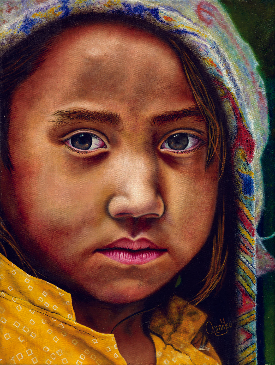 This mesmerizing portrait captures the essence of innocence and resilience in a young girl’s expression. The artist’s meticulous detailing in her eyes draws the viewer in, conveying a profound depth of emotion—curiosity intertwined with an unspoken melancholy. The textured brushstrokes bring out the earthy tones of her skin, while the vibrant colors of her scarf and yellow dress contrast with her pensive demeanor, creating a harmonious balance between vibrancy and solemnity. The soft background allows the subject to take center stage, emphasizing her humanity and individuality.
