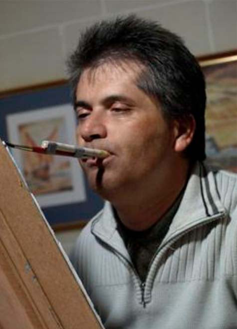 Francis Camilleri, born in 1962, has been a quadriplegic since a diving accident in 1978 and is therefore confined to a wheelchair. Through Izda Art Publishers, he learned how to paint using his mouth and made great progress in a relatively short time. Today, he has mastered various techniques of mouth painting and mainly paints landscapes, urban panoramas, and folkloric scenes in addition to Holy Nativity scenes.