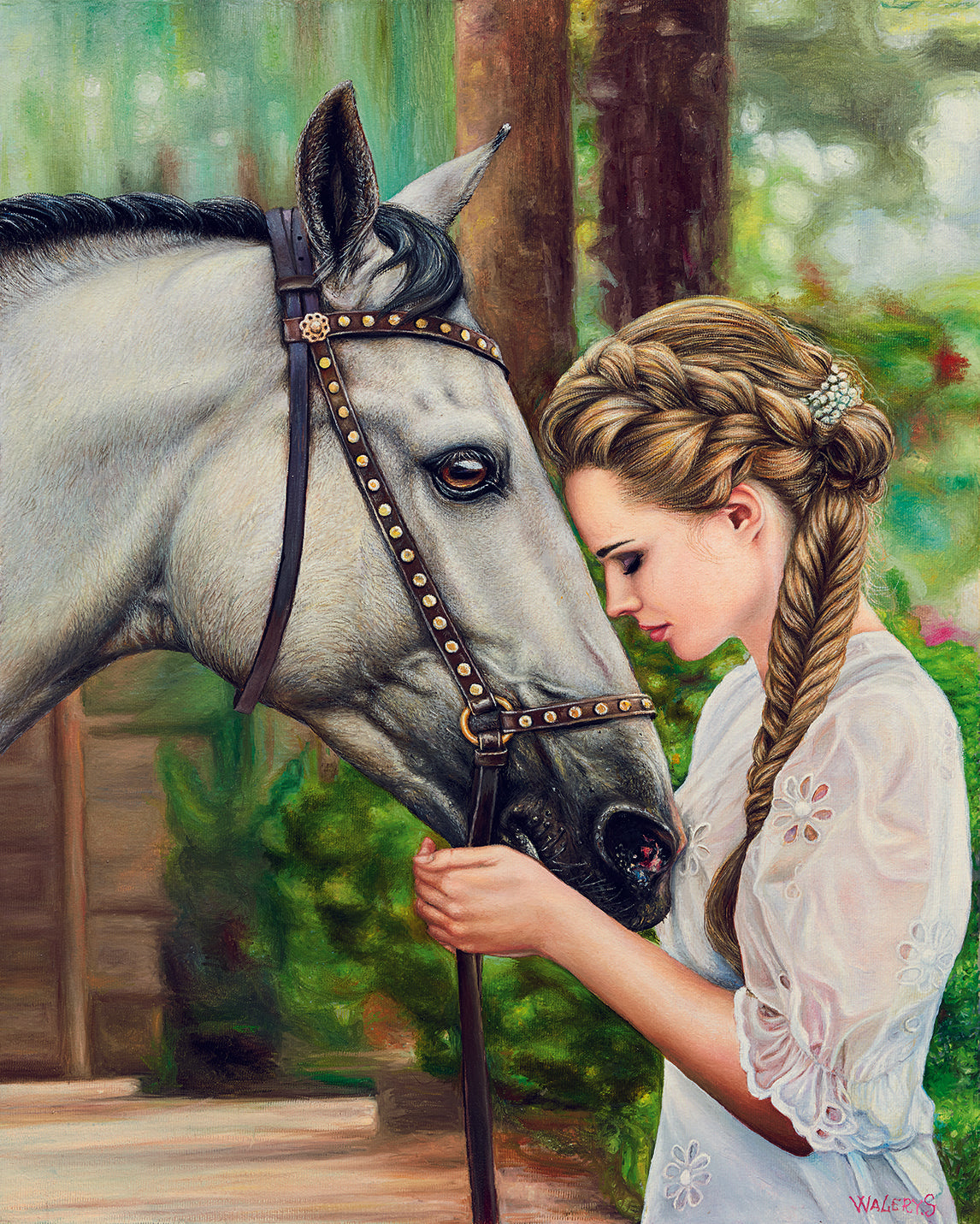 This painting is a serene portrayal of the unspoken bond between a girl and her horse, captured with meticulous realism. The artist’s delicate brushstrokes bring out the smooth textures of the horse’s coat and the intricacy of the girl’s braided hair. Her downcast eyes and gentle touch speak of trust and tenderness, creating an intimate moment frozen in time. The warm, dappled light filtering through the background trees enhances the ethereal quality of the scene, blending nature and emotion seamlessly. This painting evokes a sense of peace, underscoring the harmony that can exist between humans and animals.