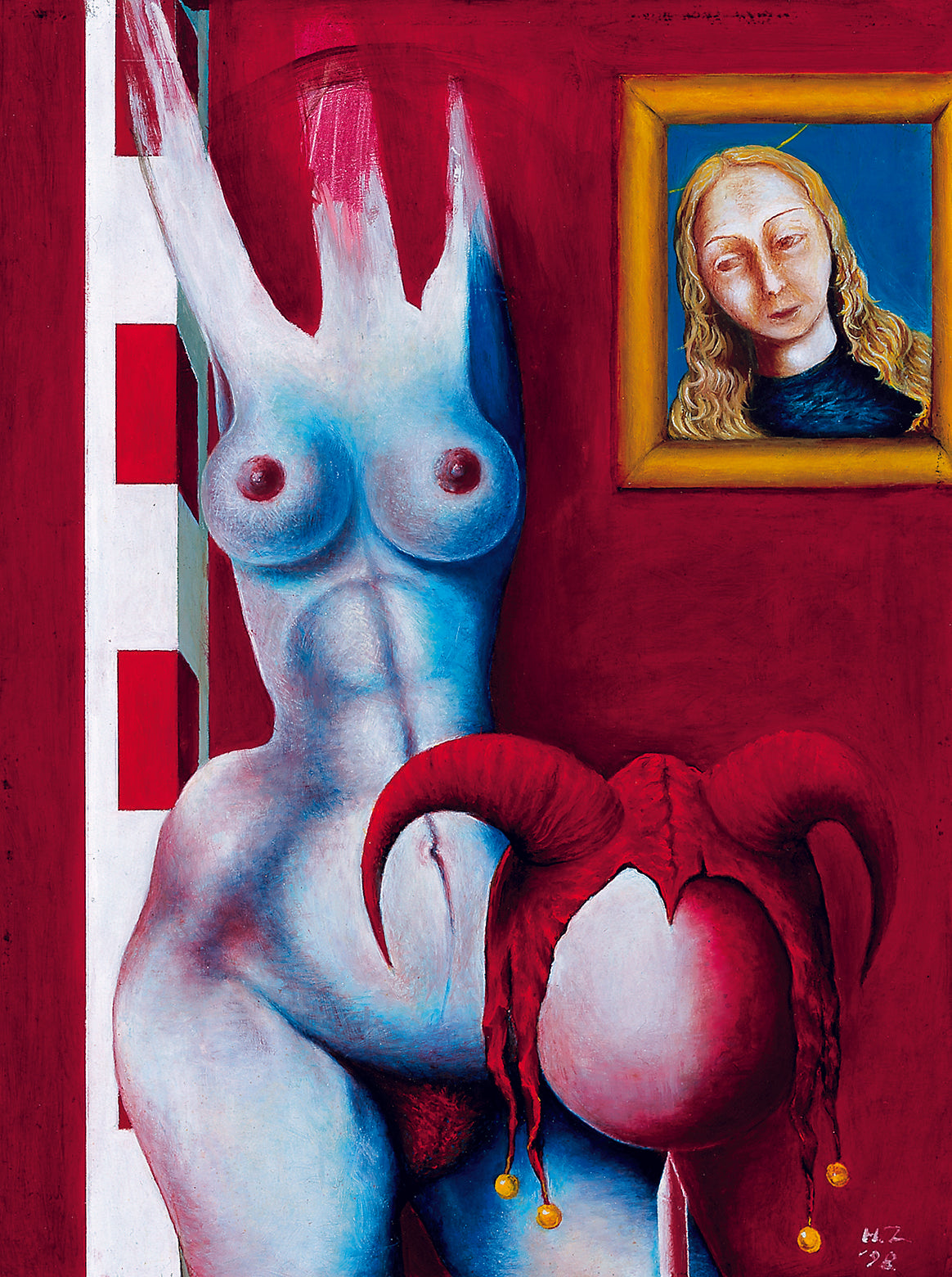This avant-garde painting juxtaposes the feminine form with bold, surrealistic elements, creating a compelling exploration of identity and expression. The central figure, rendered in striking blues and reds, blends the softness of the human body with the sharpness of abstraction. The jester’s cap and framed portrait in the background hint at themes of performance, artifice, and societal roles. The fragmented composition, with its red-and-white striped accents, creates a visual tension that invites deeper contemplation. The painting challenges traditional notions of femininity and beauty, presenting the viewer with a layered narrative of complexity and strength.