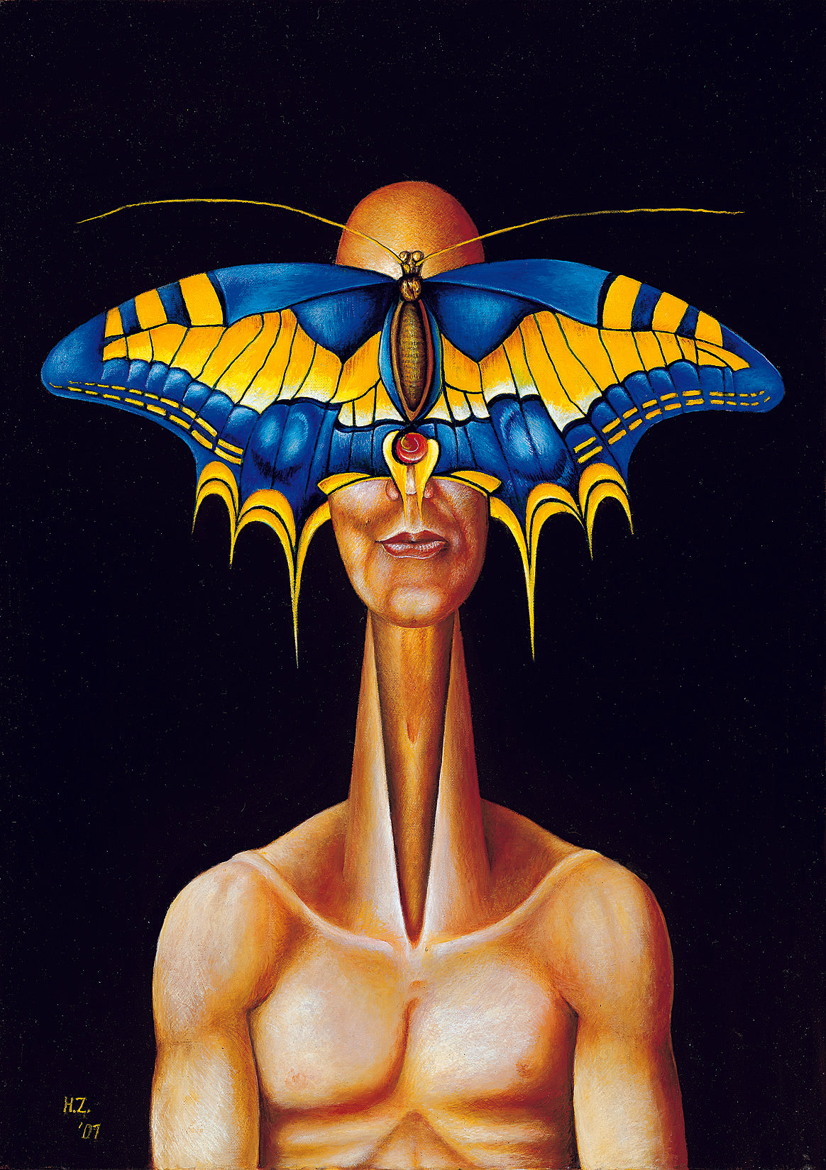 This striking painting features a human figure with a vibrant butterfly masking their eyes, merging humanity with the natural world in a symbolic interplay. The butterfly’s bold yellow and blue wings contrast against the dark background, creating a luminous focal point. The figure’s elongated neck and symmetrical composition add a surreal quality, emphasizing the fusion of human vulnerability and nature’s beauty. The painting explores themes of transformation, freedom, and the duality of concealment and revelation. It draws the viewer into a contemplative space where the butterfly becomes a metaphor for metamorphosis and the ability to see the world through a new lens.