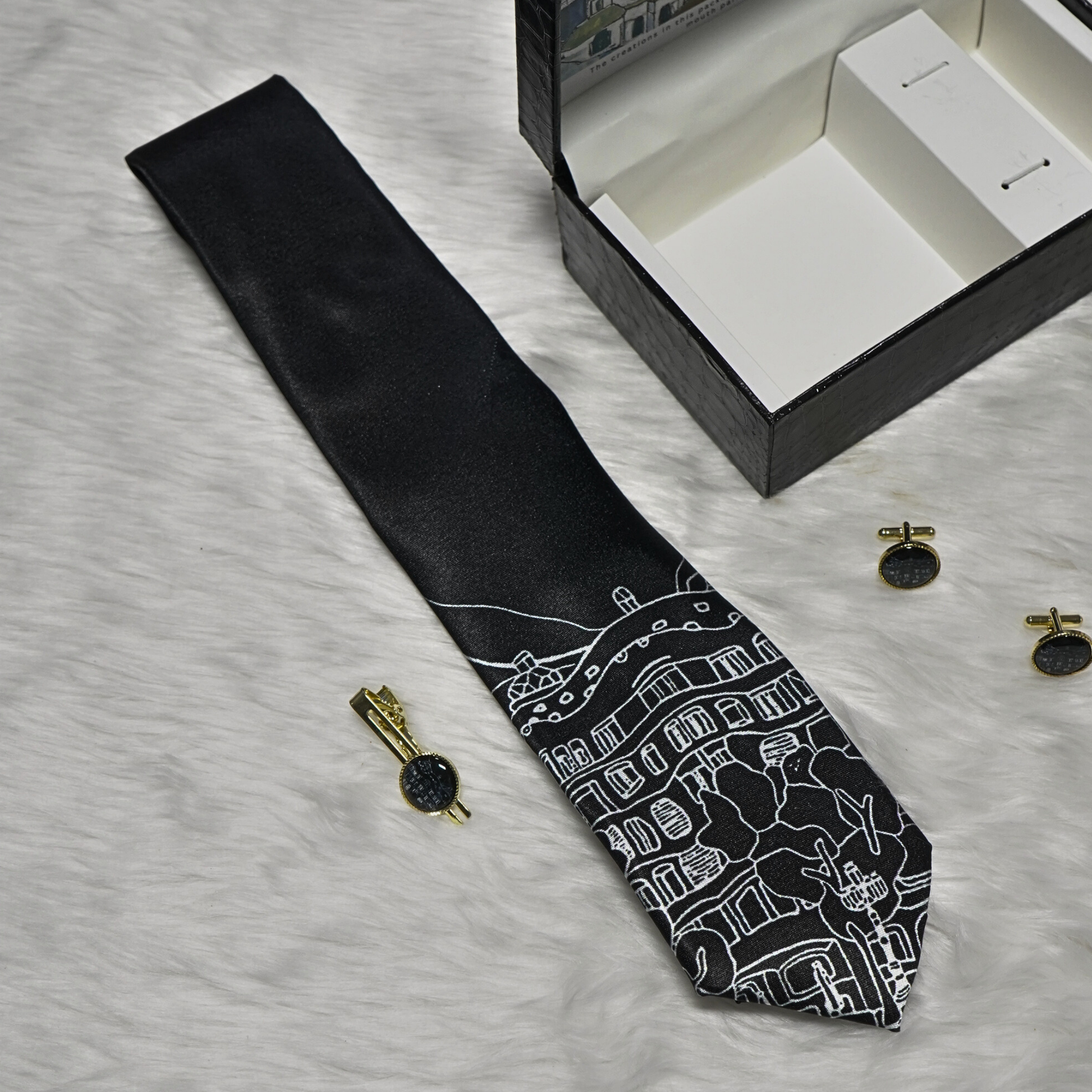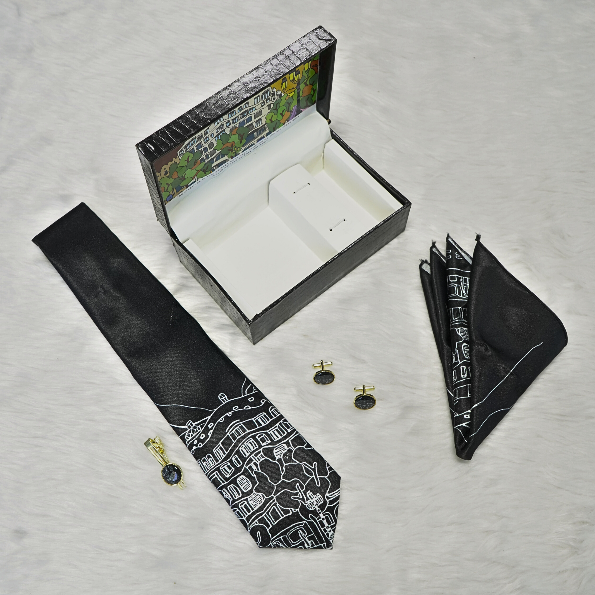 Introducing the Signature Tie Set by MFPA – a perfect blend of artistry and elegance. This luxurious set includes a finely crafted Tie, Cufflinks, Pocket Square, and Tie Bar, all adorned with unique artwork created by talented MFPA artists.