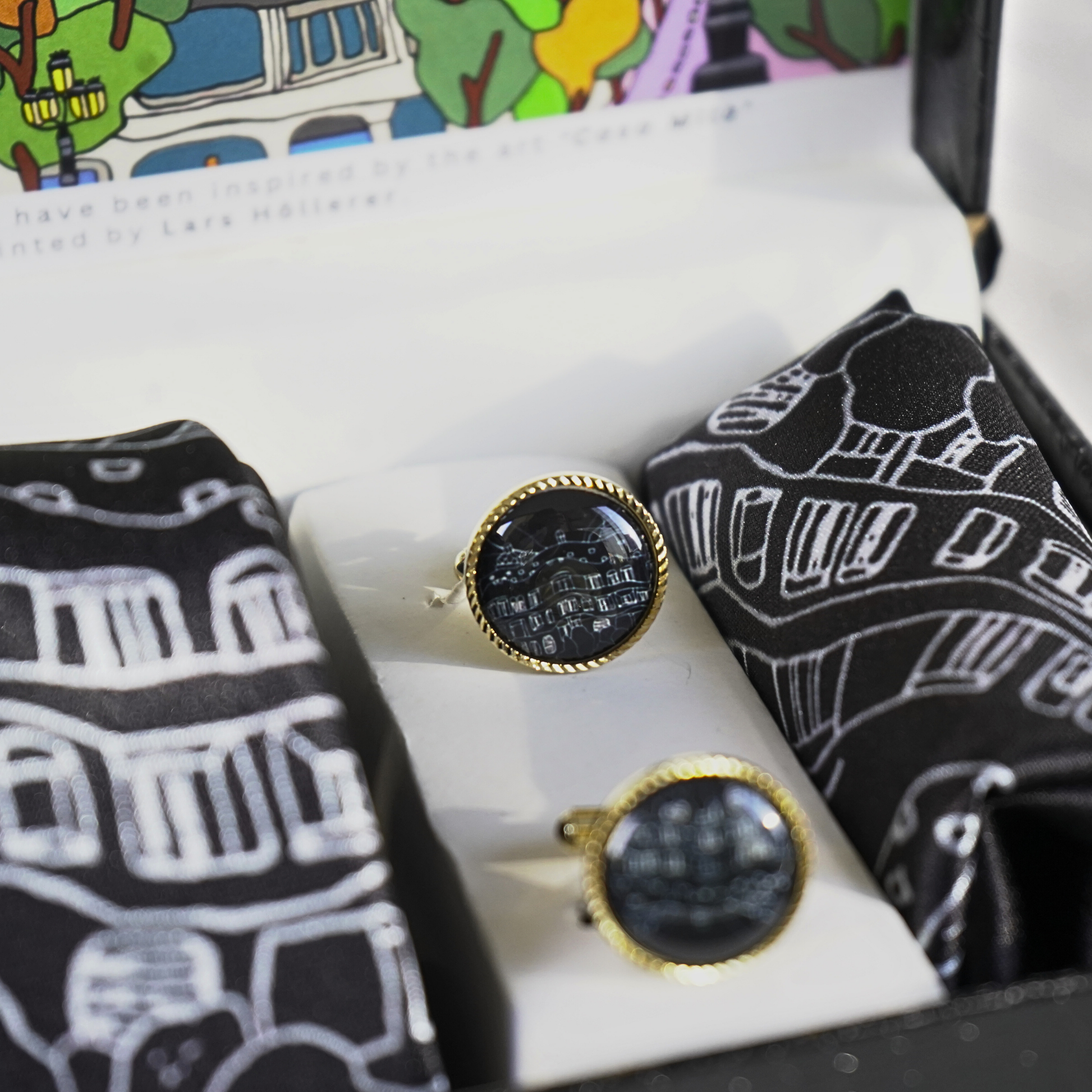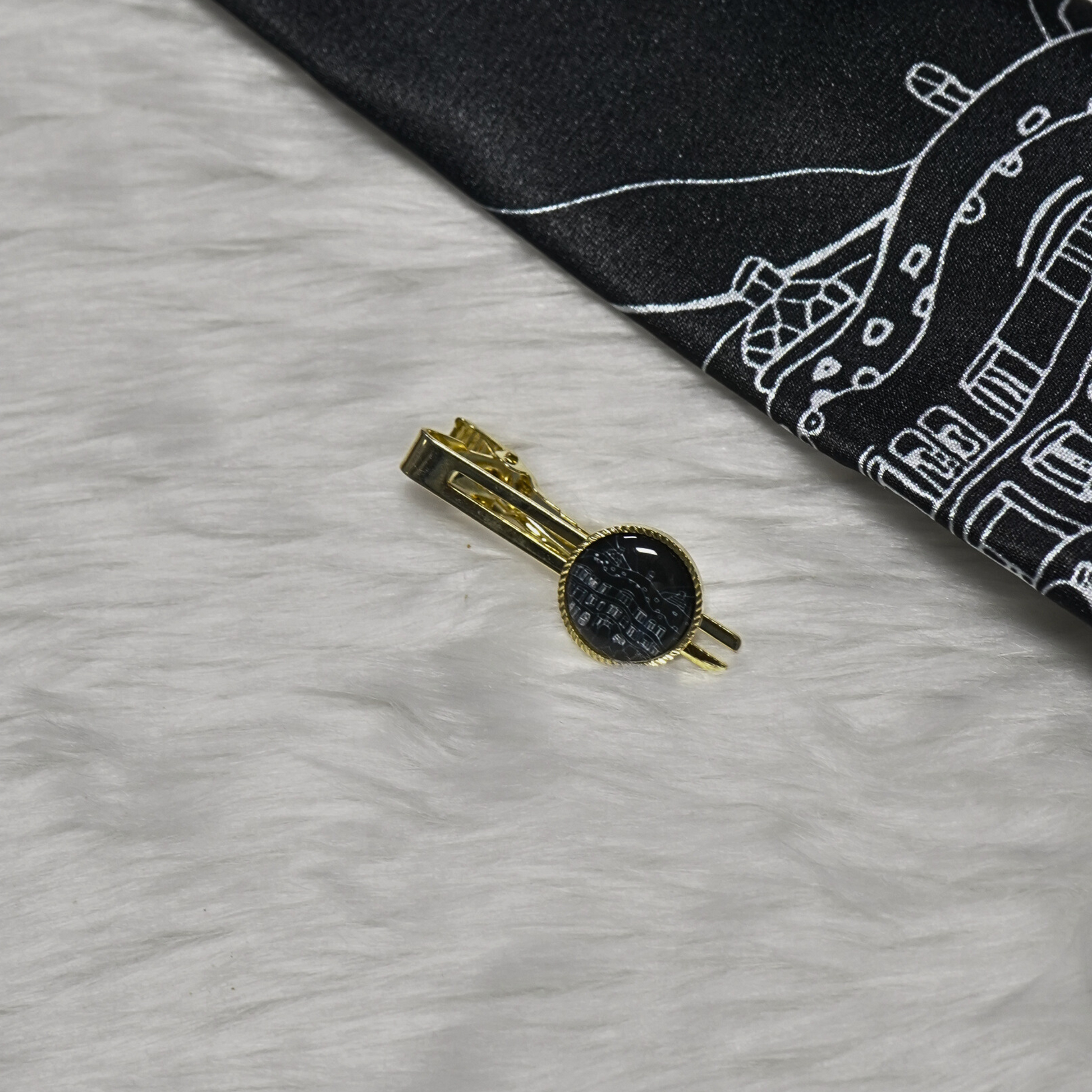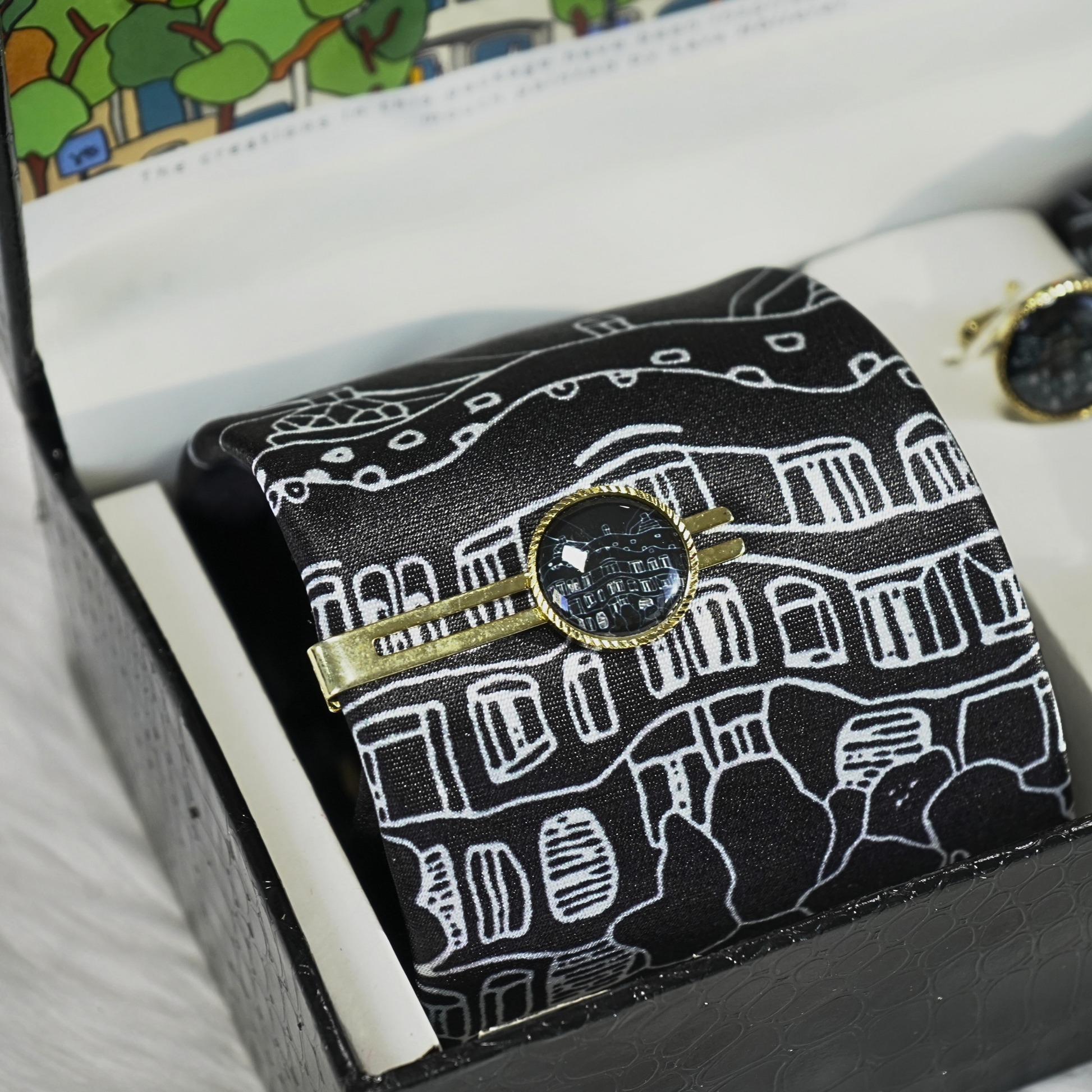 The Cufflinks and Tie Bar are made of durable gold-colored Stainless Steel, adding a touch of sophistication to your ensemble. Each piece is a testament to the creativity and resilience of our artists, combining functional fashion with thought-provoking art.