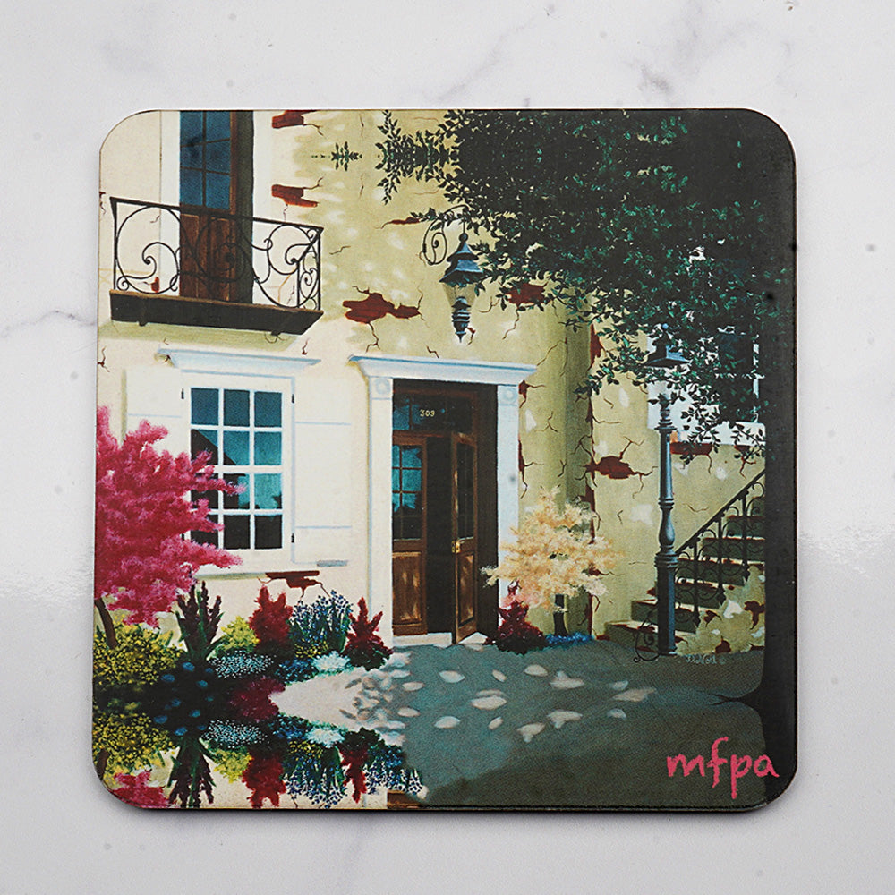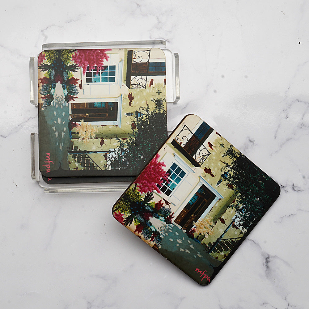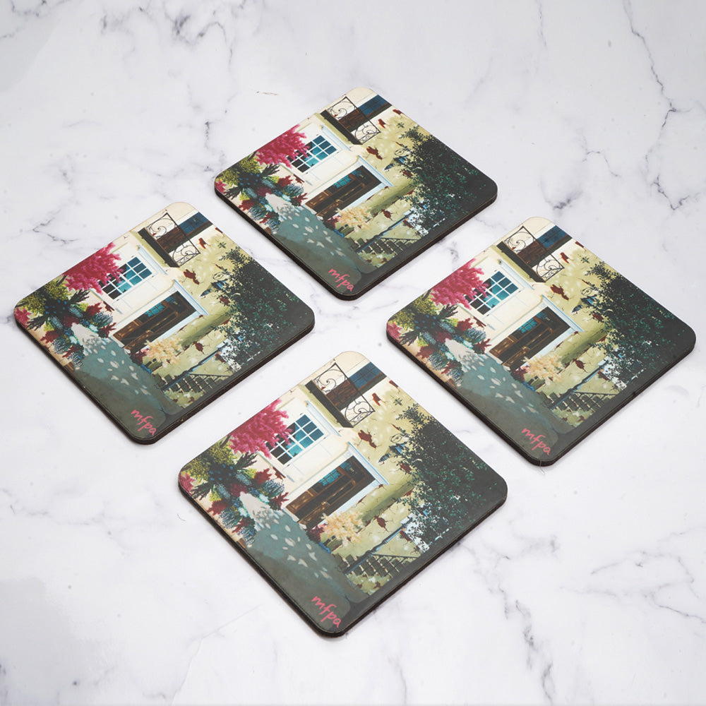Sip your favorite beverage and cozy up with “The Cozy Cottage” print on these coasters. The quaint and charming cottage nestled in the midst of the serene surroundings adds warmth and comfort to your space. With its rustic beauty, this print is perfect for those who love the simple pleasures of life. Let the cozy vibes of this print seep into your soul and soothe your spirit, as you unwind and relax in the comfort of your home.