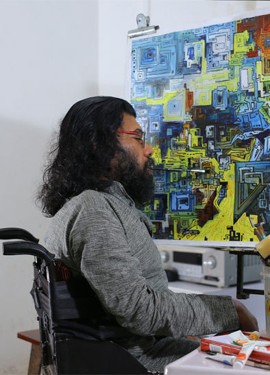 Born on 15 October 1969, Ganesh Kumar hails from Kannur, a small town in Kerala. At the age of one, he was affected by polio. But despite his disability, Ganesh started writing and painting early from the age of three. Gradually, over a period of time, Ganesh lost the complete use of his hands and feet, thereby restricting the artist to a wheelchair for life. Slowly he began to use his mouth to write and paint. He did not attend formal school but yet learned to read and write in English. Everything he does is self-taught including mouth painting. At the moment, Ganesh Kumar’s work consists of over 3000 paintings. He has been a member of the MFPA since 1988.
