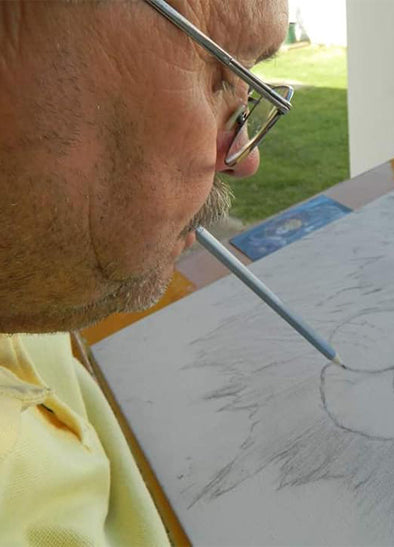 May 1956 in Cradock. In December 1987, he become a quadriplegic due to a diving accident and injury to the spine. Because of this, his limbs were completely paralyzed. Some years later Martinus began with mouth painting, which he learned autodidactically. In 1996 the association granted him a scholarship. His work proved his artistic talent. Sadly the mouth artist passed away on April 15, 2020.