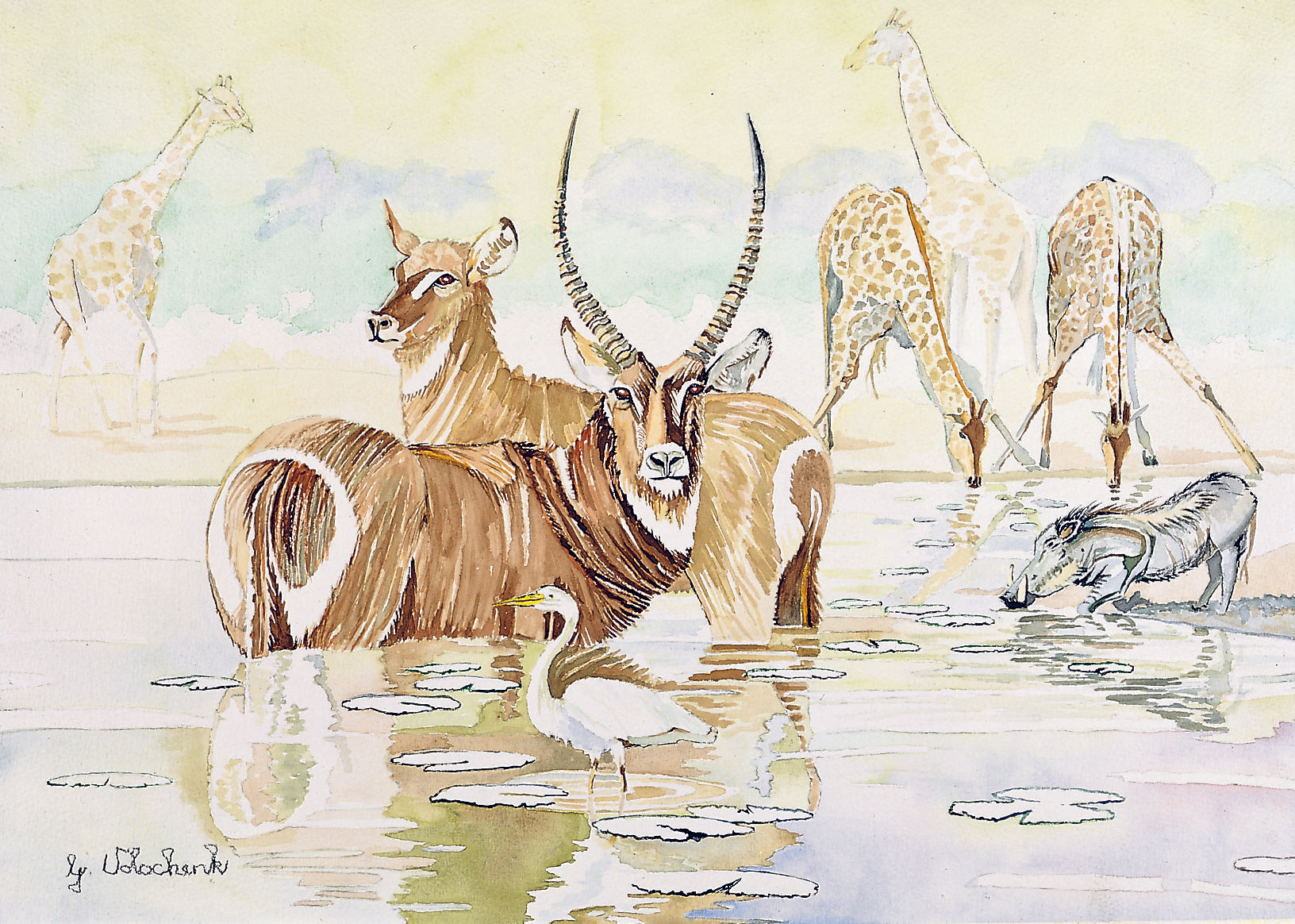 A tranquil safari scene featuring serene wildlife captured in soft watercolors. The delicate brushstrokes highlight the grace of antelopes, giraffes, and other creatures, their reflections rippling in the water. This serene tableau celebrates nature's harmony, evoking the calm and majesty of untouched wilderness.