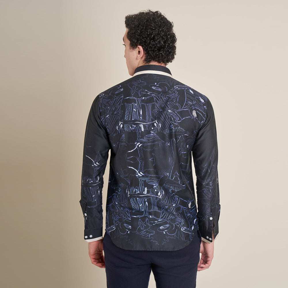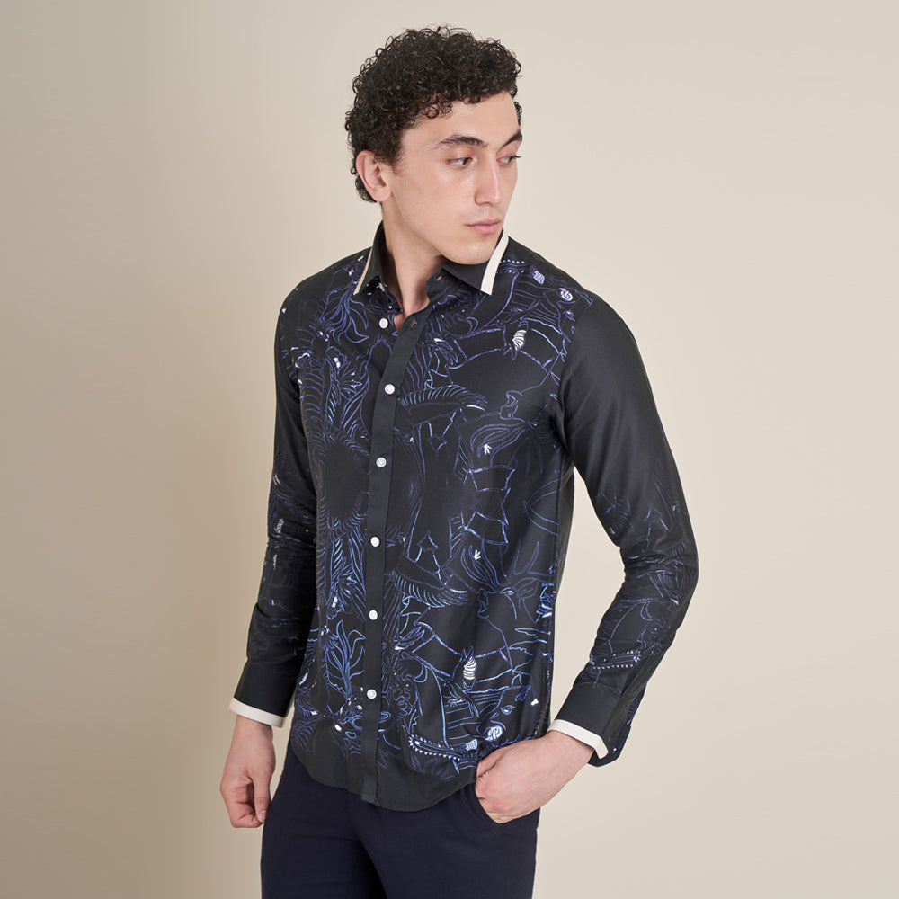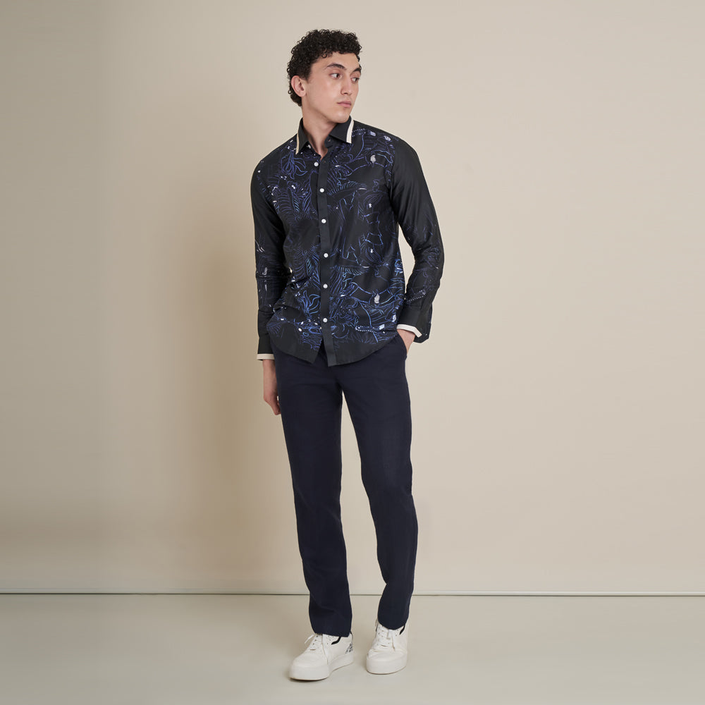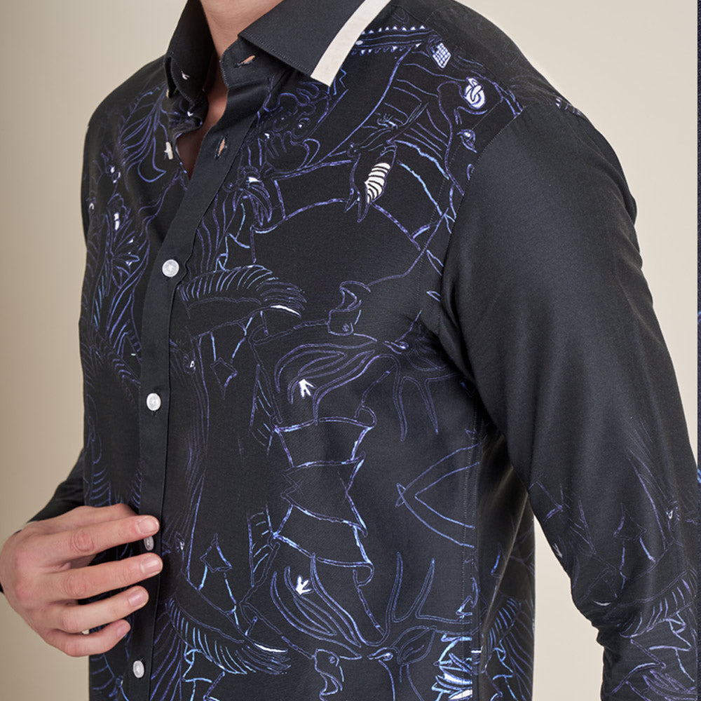 Introducing the Epitome of Artistic Splendor: This canvas cotton linen shirt embodies the essence of fashion redefined, meticulously curated for the discerning gentleman who appreciates the fusion of art and style. Crafted with utmost precision, this slim-fit shirt is adorned with an exquisite pencil line art masterpiece, “La chasse au bžcheron”. It’s a work of art that transcends mere clothing, bringing a touch of sophistication to every inch. As a standalone statement, this shirt exudes an aura of understated elegance, making you the center of attention at any event. Elevate your look, embrace the art of individuality, and bask in the limelight with this exceptional masterpiece that’s set to rock the party.