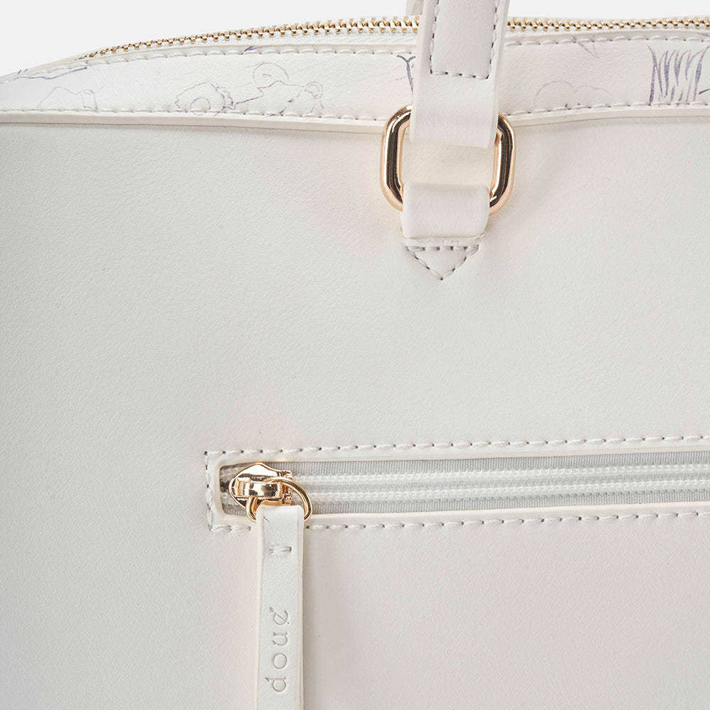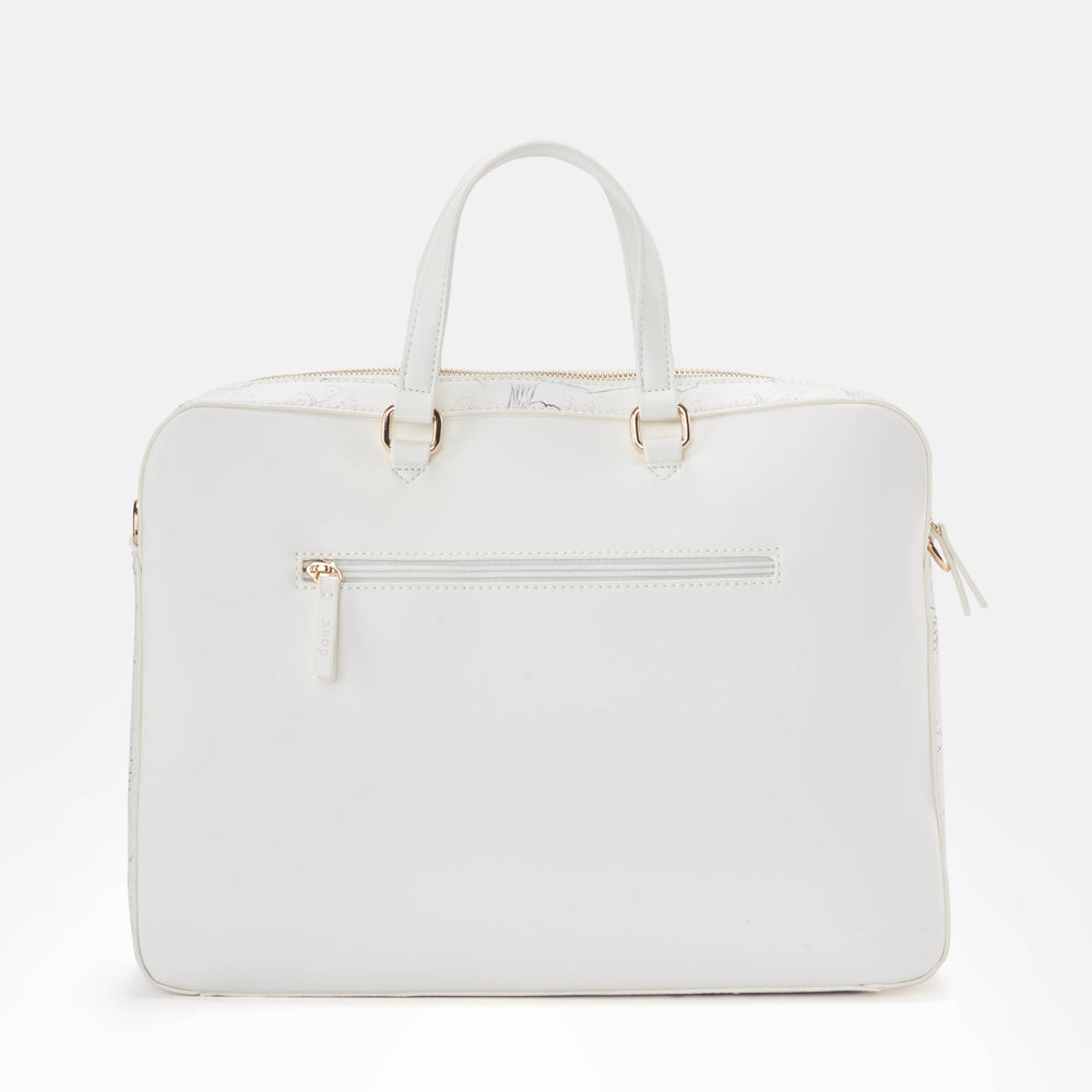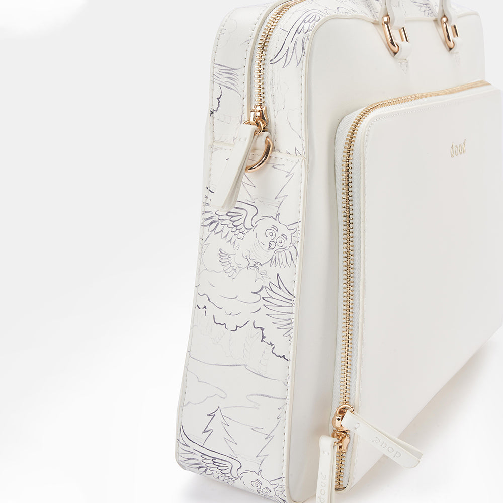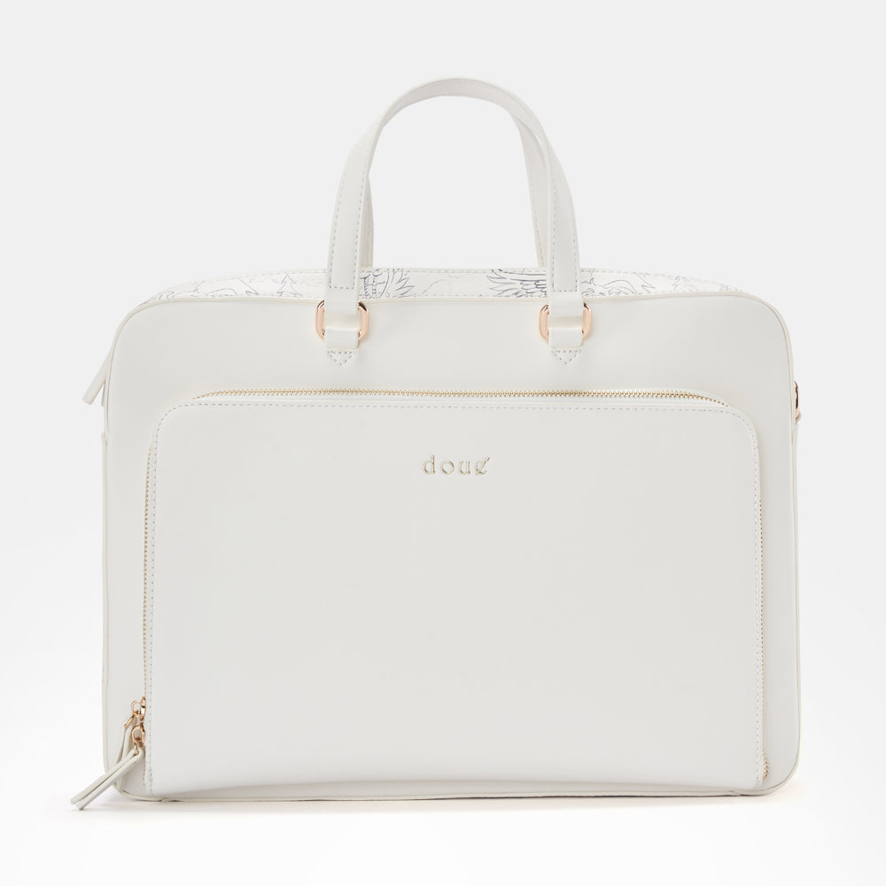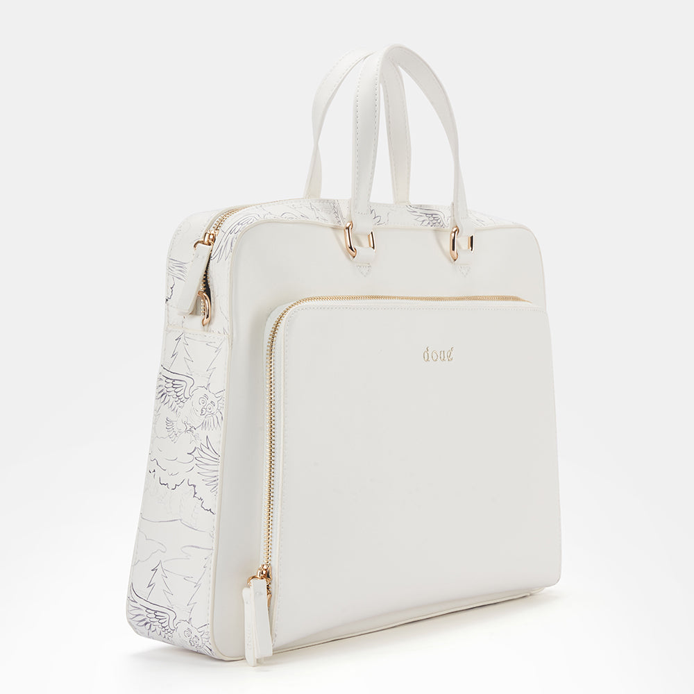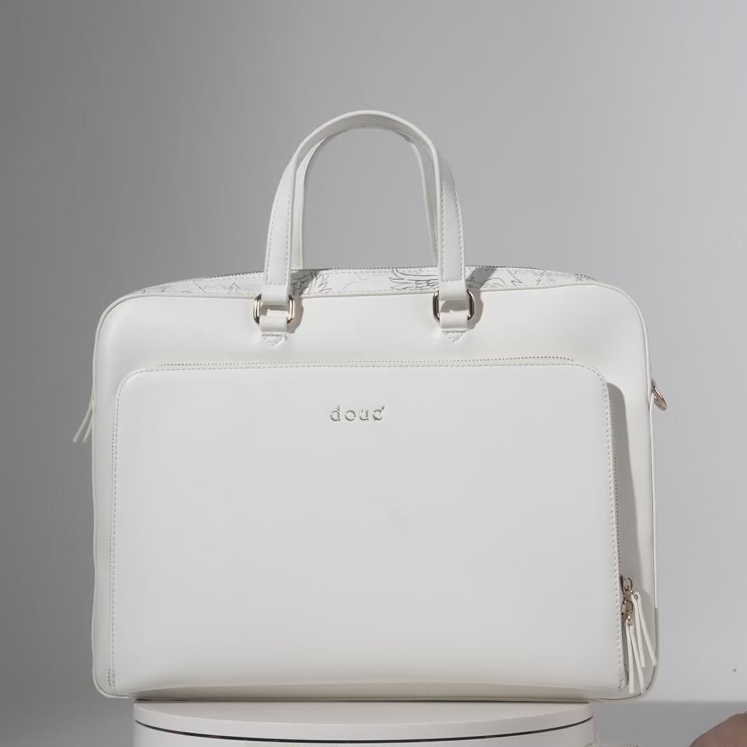 Introducing The Woodcutter’s Hunt from the Exécutive Finesse Collection by Doué. This sleek and stylish bag in white features a beautiful line artwork, subtly designed to add a touch of elegance. Perfect for the office, it comfortably fits most medium-sized laptops and offers ample space for additional files and essentials. Crafted with practicality in mind, it includes a small handheld handle and a shoulder sling for versatile carrying options. The bag’s unique feature is its stylish monochromatic line art, visible on the sides when moved, blending seamlessly into a clean office look when stationary. The inner lining proudly displays the Doué logo, emphasizing its quality and sophistication. Designed for both men and women, The Woodcutter’s Hunt combines functionality with timeless style, making it an essential accessory for the modern professional. Elevate your office attire with this distinguished bag, where practicality meets sophisticated design in every detail.
