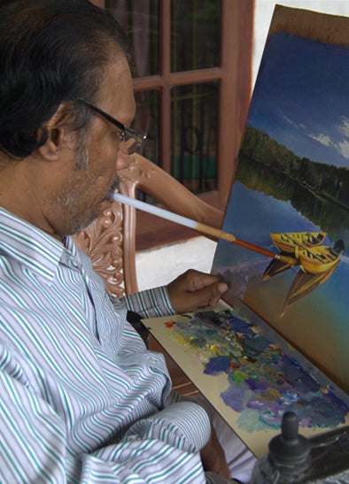 Ravindran uses oil and acrylic paint for his paintings. His favourite
