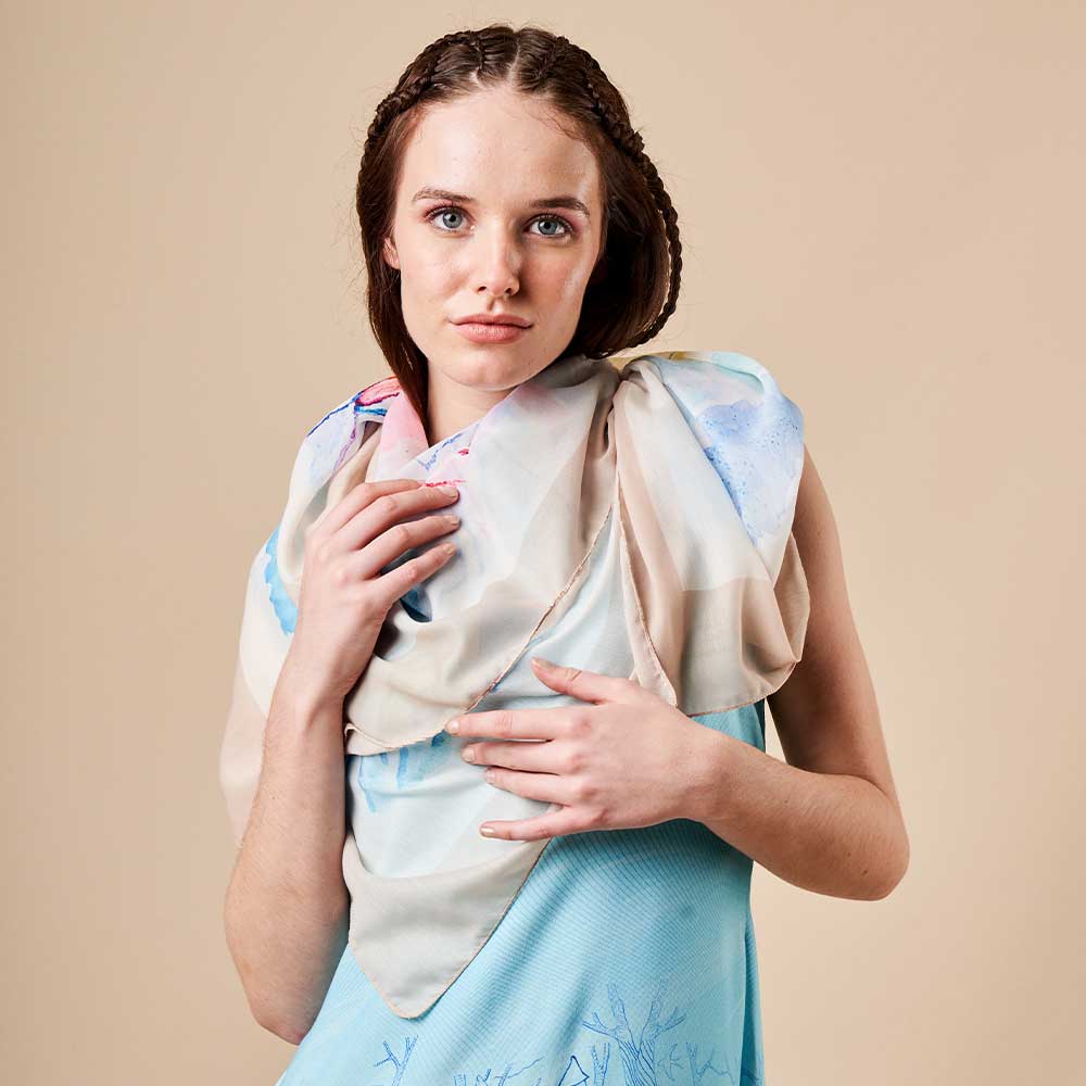 This one is a pleasant pick with soothing and calm tones. Perfect for a date night or a casual evening with friends. You can flaunt it with any outfit of your choice. This beautiful scarf derives its print from an original artwork made by a specially-abled artist. This scarf is made using high-quality material, is digitally printed, and is great for daily use. Flaunt this one proudly!
