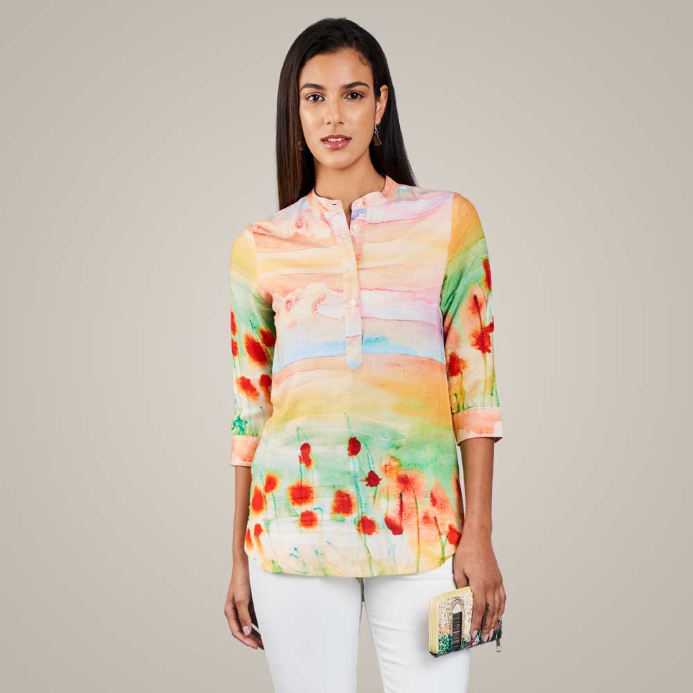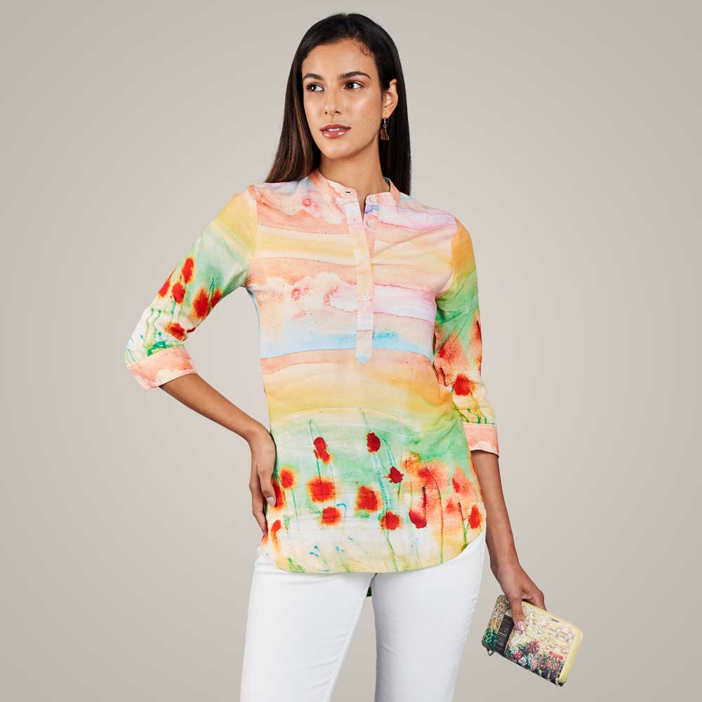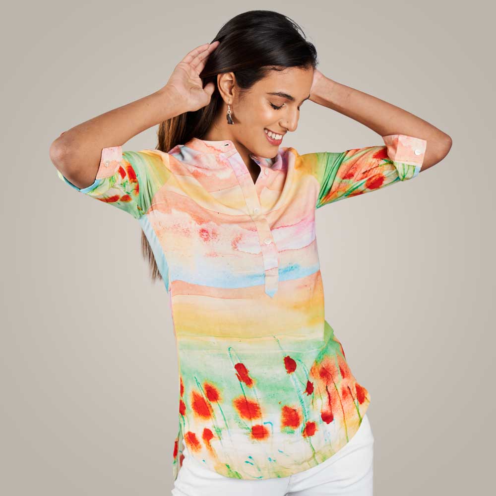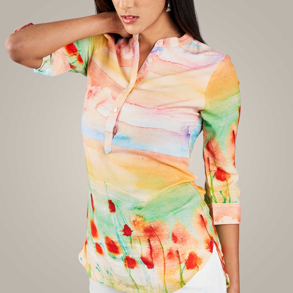 The silhouette: This light and stylish shirt is very pleasant on the skin. With a viscose fabric, it’s slightly short in the front and long at the back and perfect for a classy day or evening look. The digital print is a painting created and designed by our mouth and foot painting artist.