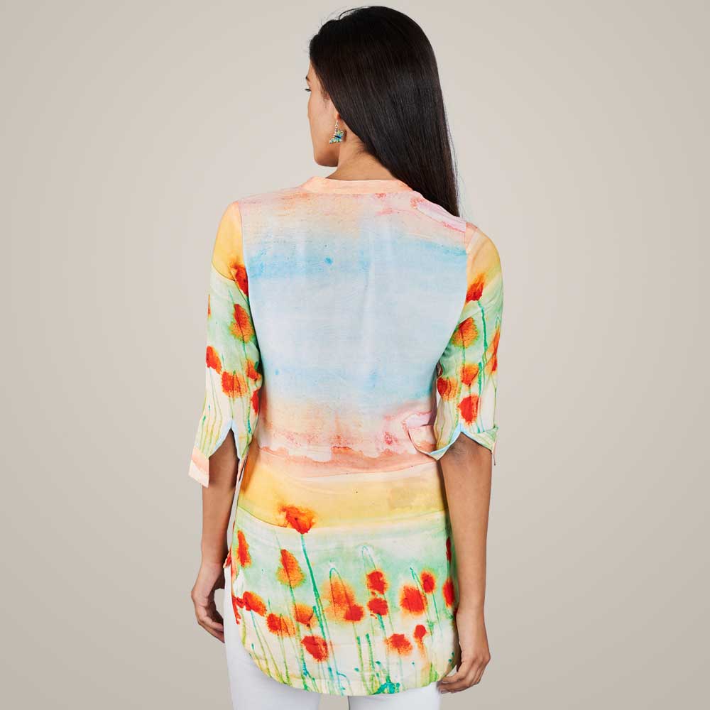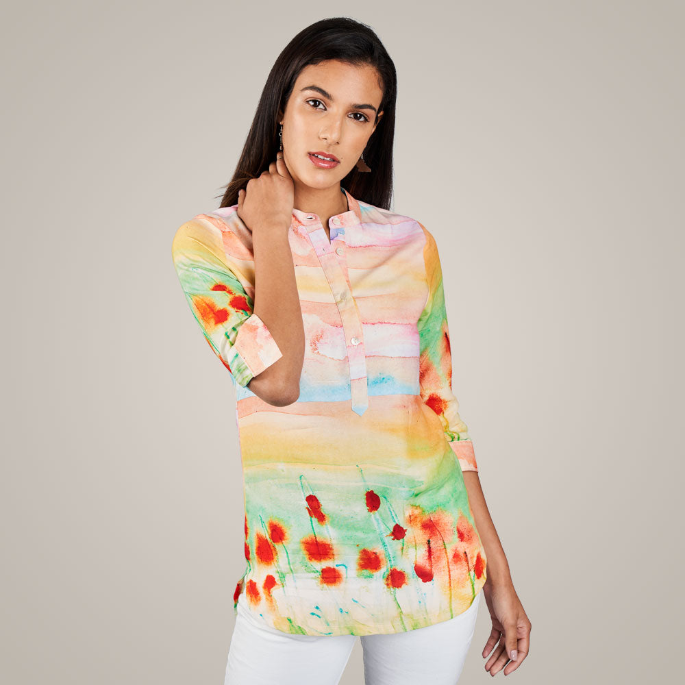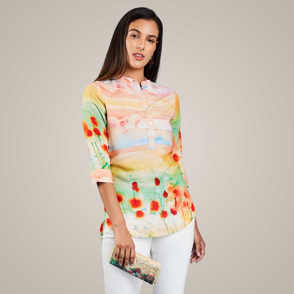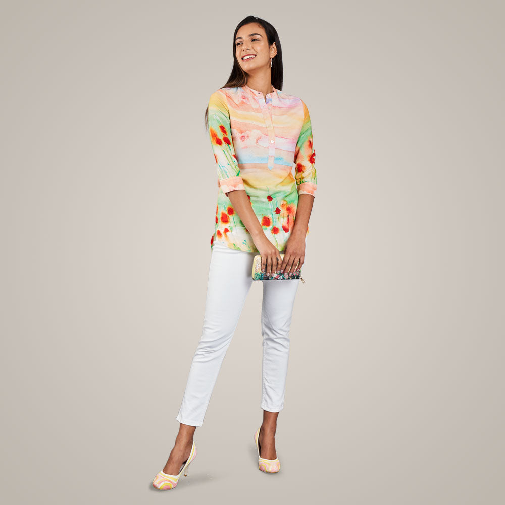 The silhouette: This light and stylish shirt is very pleasant on the skin. With a viscose fabric, it’s slightly short in the front and long at the back and perfect for a classy day or evening look. The digital print is a painting created and designed by our mouth and foot painting artist.