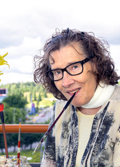 Born on 8 November 1936 in Koski, Anja Hämäläinen–Numminen contracted polio in 1951 and lost the use of her arms. It took Anja, who had always enjoyed embroidering, knitting and drawing patterns, three or four years before she began to paint and draw with a utensil in her mouth. Anja Hämäläinen-Numminen primarily depicts the landscapes of her native country, but also floral arrangements, people and mythical creatures.