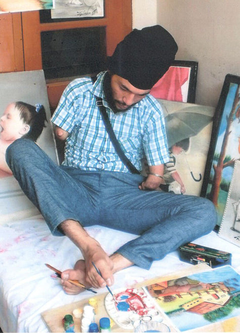Jagwinder Singh was born on 3 April 1991 in Punjab, without both his arms. He and his family had to struggle to get him admitted to a school. Questions about his inability to use hands became the motivation for him to use his feet for writing and other works. He was interested in drawing from his childhood, mostly influenced by his father who is a needleworker. Watching his father do embroidery was his first creative insight. After finishing his school he did a two-year diploma in art and craft. Other than being an artist, he is a prospective National Para Cyclist.
