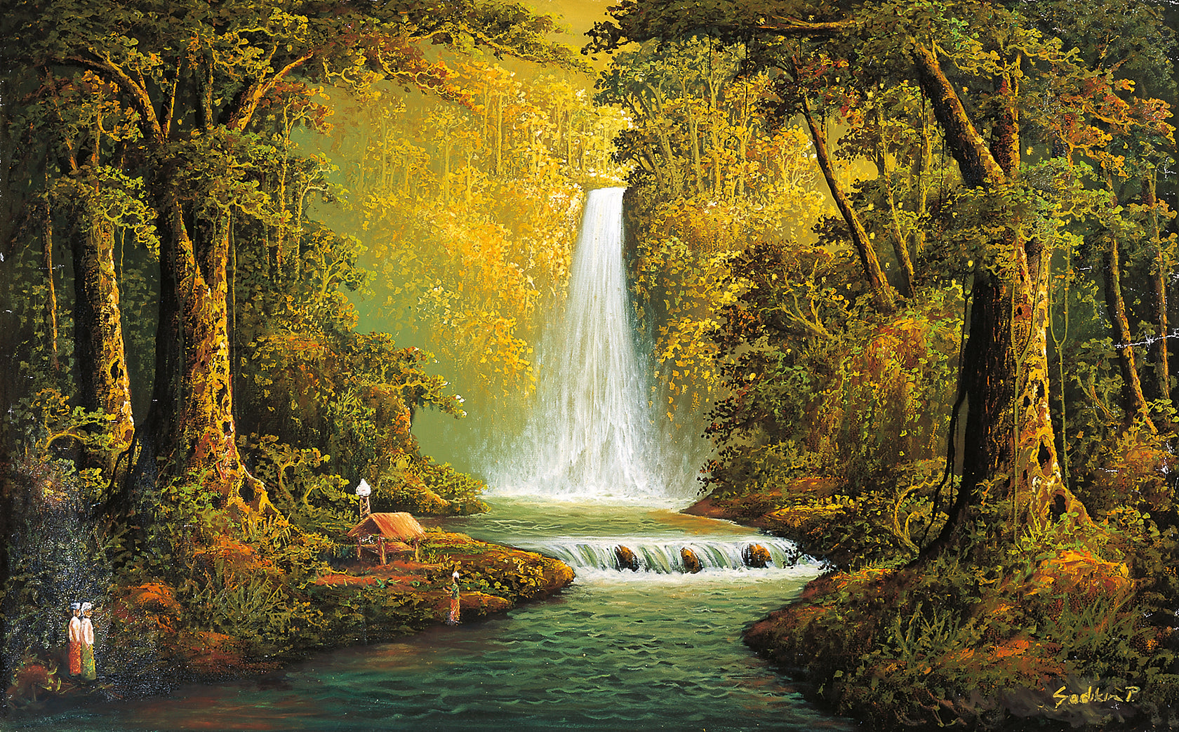 A golden light filters through the dense forest canopy, illuminating the majestic waterfall at the heart of this painting. The artist employs intricate brushstrokes to capture the intricate details of the trees and water, creating an atmosphere of awe and reverence. The scattered villagers and rustic hut lend a storybook quality to the scene, portraying a harmonious coexistence between humans and nature.