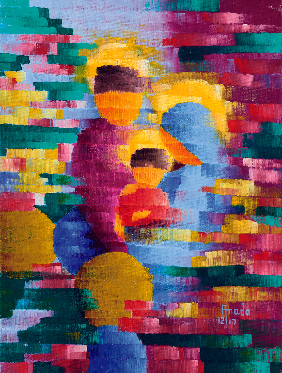 In "Fragments of Us," the artist paints with bold blocks of color, creating a family-like silhouette hidden within the mosaic. The fragmented nature of the piece mirrors the complexities of relationships, each stroke suggesting a connection or memory shared between the figures. The vibrant purples, yellows, and reds evoke warmth and love, while the blurred lines represent the intangible bonds that hold us together, even when the details of life become unclear. The style, reminiscent of a cubist influence, is both modern and timeless, celebrating the beauty found in imperfection and unity.