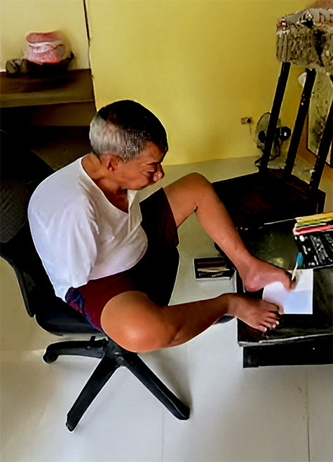 Amado Binwag Dulnuan was born without arms. At the age of five, his family sent him to a home for disabled people. He received primary and secondary education in a school for disabled children. After school he studied fine arts at the University of the Philippines up to the fourth study year. The favorite subjects of Amado are the Philippine landscape and flowers and his favorite technique is oil painting. He has received several distinctions for his works and was also honoured by his hometown Ifugao.