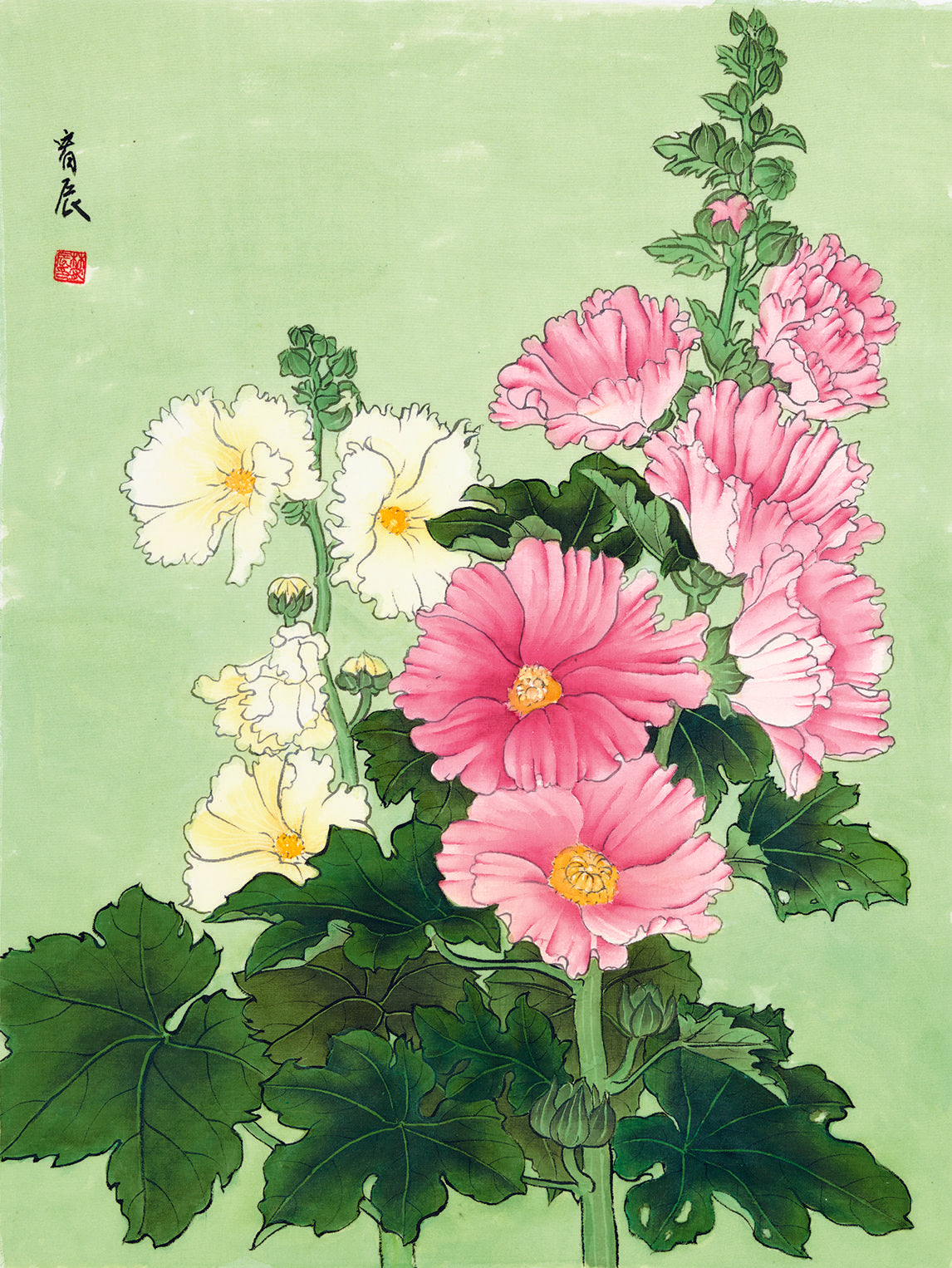In Garden of Hollyhocks, the artist invites us into a lush world of pink and white hollyhocks, flourishing against a soft green backdrop. Each bloom is painted with a lightness that suggests a soft breeze moving through the garden. The vibrant pinks and delicate whites of the flowers contrast beautifully, capturing the essence of a garden in full bloom. This piece reflects the simple joy found in nature’s abundance, encouraging a sense of calm and appreciation. It’s a gentle reminder of the beauty that surrounds us, waiting to be noticed and cherished.