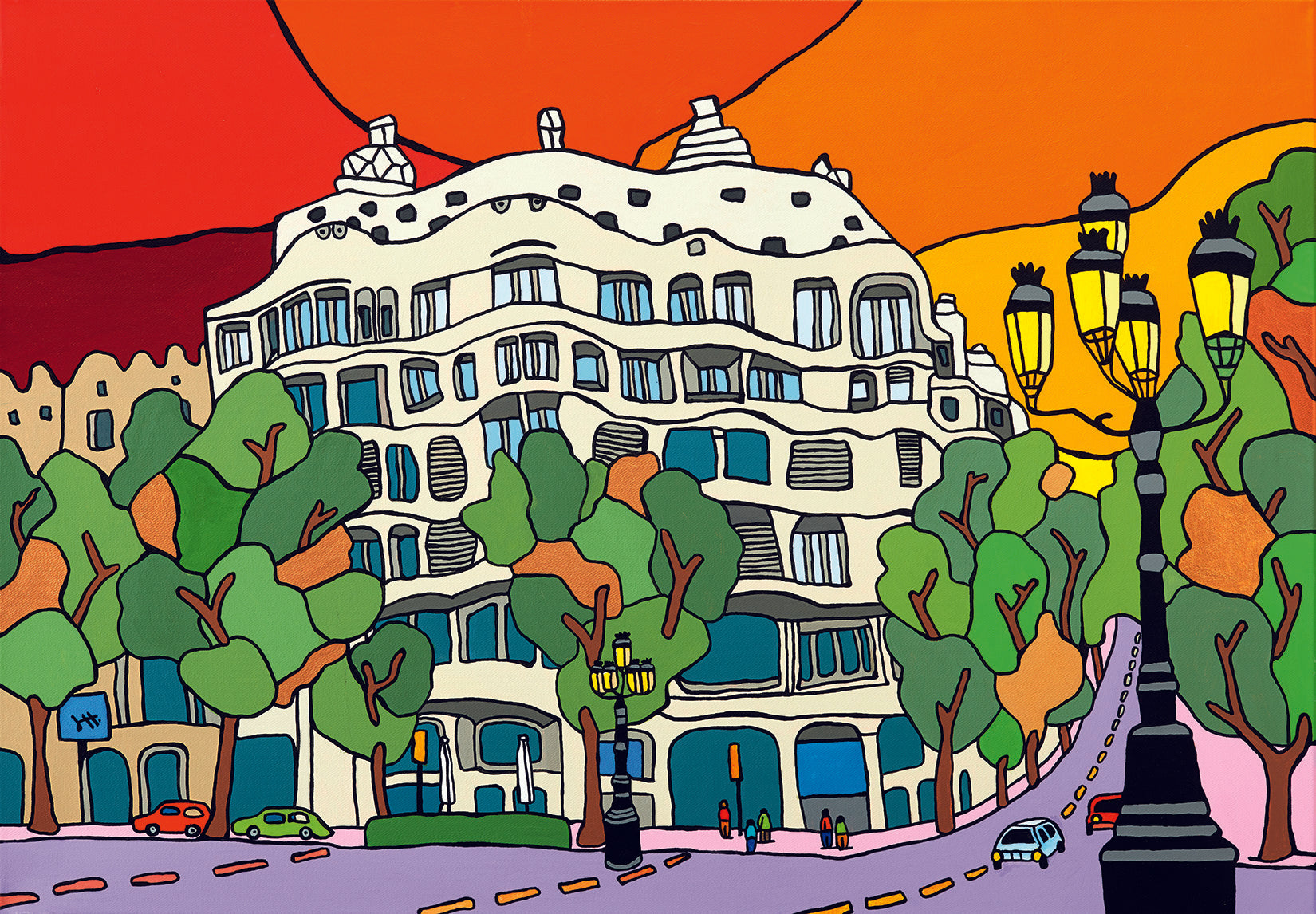Inspired by the architectural wonder that is Casa Milà in Barcelona, this vibrant painting reimagines the curves, colors, and surreal elements of Gaudí's masterpiece. The bold reds and oranges evoke the setting sun, casting a warm glow over the fantastical forms of the building’s facade. Gaudí’s organic architecture, with its playful shapes and flowing forms, comes alive here in a modern, stylized tribute. The lively colors and strong lines bring to mind the bustling life of Barcelona, where art and architecture dance together in perfect harmony.
