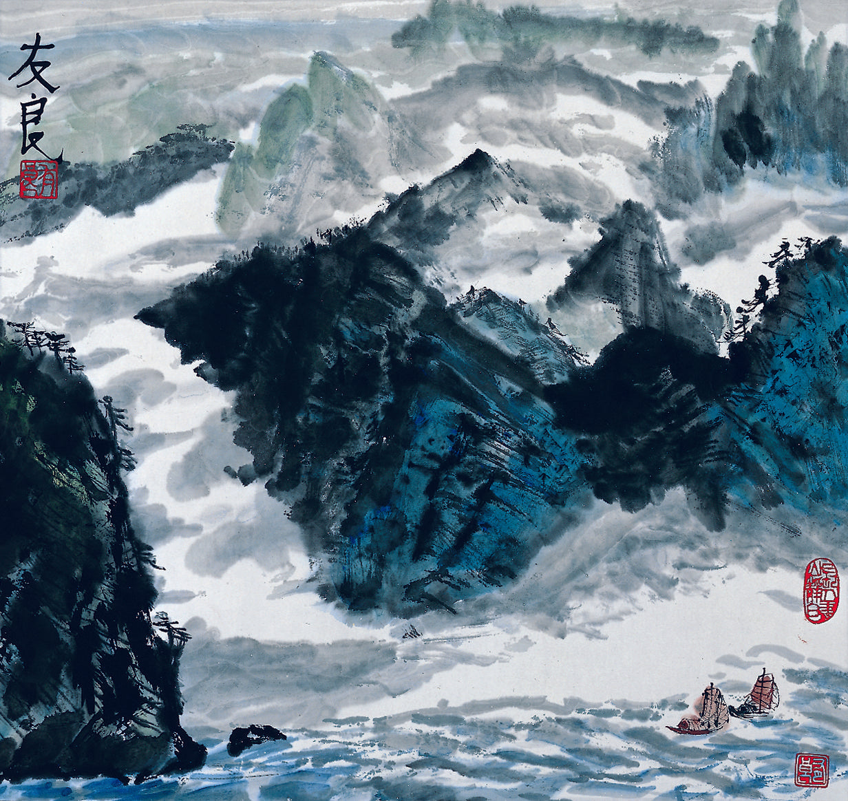 This painting captures the mist-covered peaks in a monochromatic palette, where the mountains seem to emerge and disappear into an eternal fog. The artist’s use of flowing brushstrokes and ink washes gives the scene an ethereal, almost otherworldly feel. The subtle contrast between light and shadow evokes the sense of a spiritual journey—where clarity and mystery coexist. This piece gives a sense of transcendence, as if standing on the edge of a timeless expanse, peering into nature’s secrets.