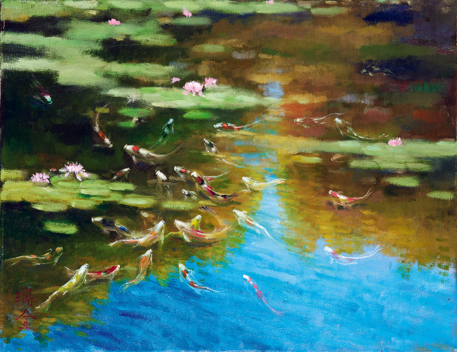 A symphony of color and tranquility, "Koi Serenade" brings to life a pond filled with vibrant koi fish and blooming water lilies. The scene radiates a peaceful stillness, where every brushstroke plays a role in conveying the gentle ripples on the water's surface. The rich interplay of greens and blues, contrasted with splashes of orange, red, and yellow from the fish, provides a sense of harmony and balance. The reflection of foliage in the water mirrors the natural world, creating an immersive depth that makes the viewer feel as though they are standing on the edge of this serene pond, quietly observing the flow of life beneath the surface.