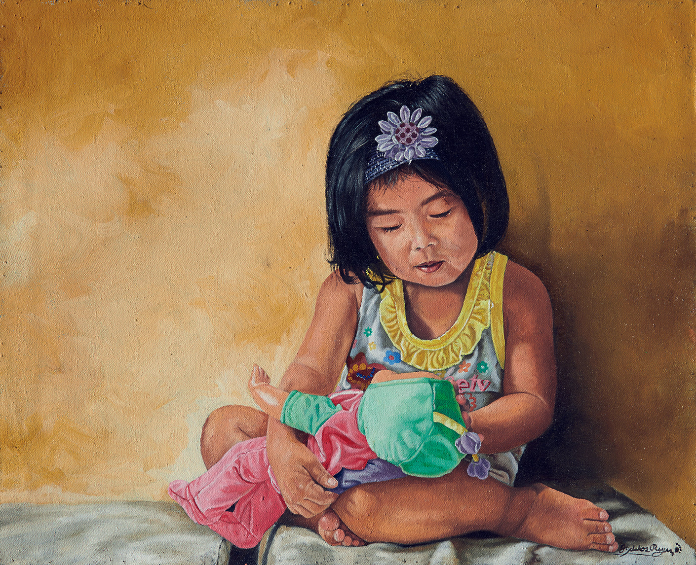 This painting beautifully captures a quiet moment between a young girl and her doll, a scene that radiates warmth and innocence. The artist’s careful brushstrokes bring a softness to the child’s expression, highlighting the purity and tenderness of childhood. With earthy tones and gentle light, the background fades away, allowing the viewer to focus solely on the intimate connection. This piece feels timeless, a reminder of the simple joys and boundless imagination that define youth.