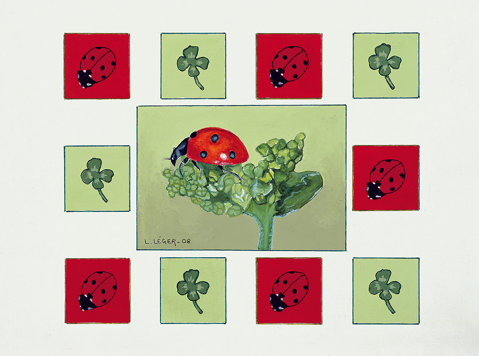 This whimsical painting, filled with vibrant reds and greens, brings the viewer into a world of simple joy and innocence. The ladybug, a symbol of luck, perches on a lively green plant while surrounded by a border of repetitive imagery: shamrocks and more ladybugs. This structured composition evokes feelings of security and balance, while the delicate realism of the central ladybug and plant brings the natural world to life. Through its vivid colors and playful repetition, the piece communicates a sense of optimism and the beauty found in small, everyday wonders.