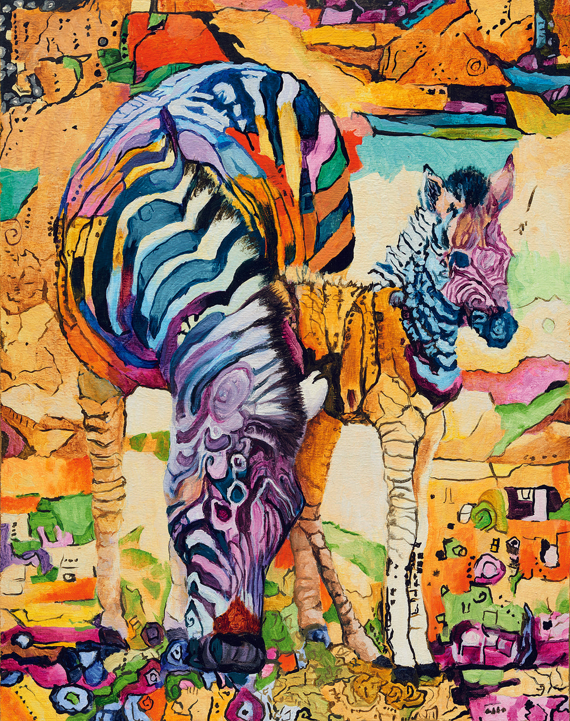 This enchanting depiction of a zebra and its foal is set against an explosion of abstract, vibrant hues. The zebra's iconic black and white stripes are artistically reimagined, flowing with striking patterns of pinks, purples, and oranges. The bold and brilliant background contrasts with the tender maternal moment, reminding us of the beauty and diversity of life in the wild. The kaleidoscopic effect invites the viewer to reflect on the harmony between nurture and nature.