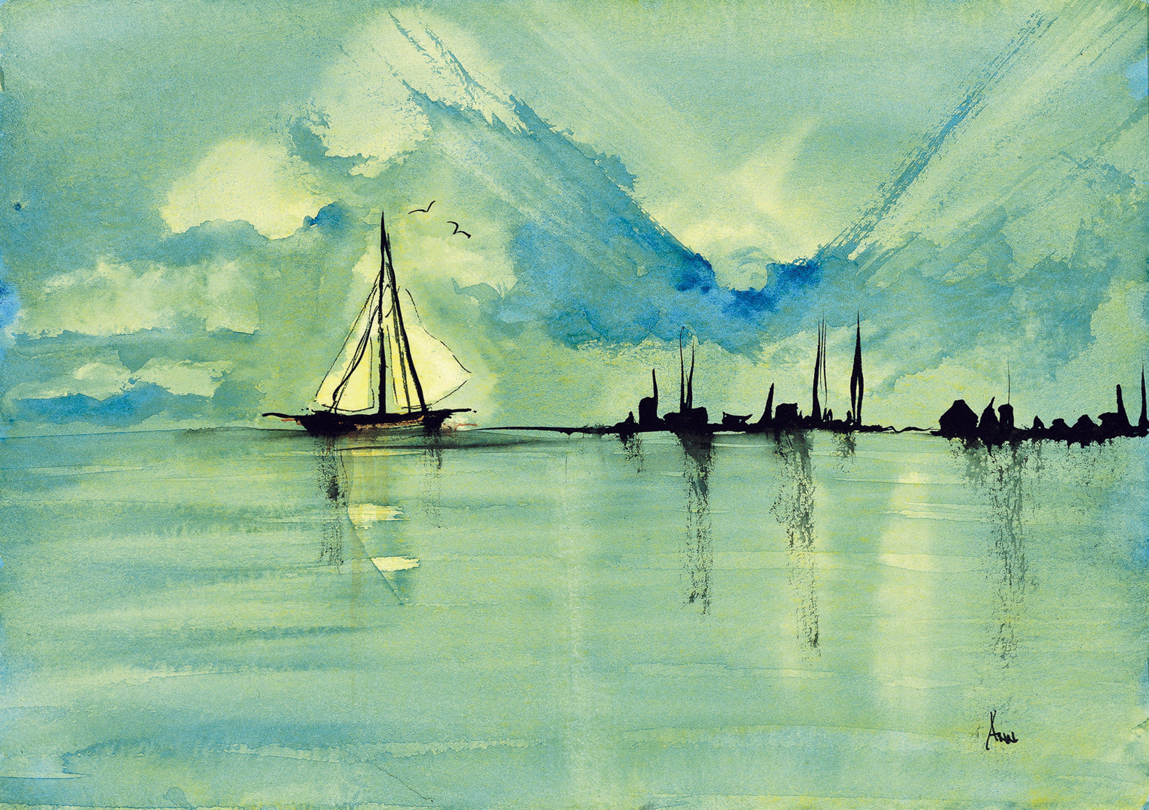 The painter’s masterful interplay of light and texture in this ethereal seascape invites the viewer into an almost meditative reverie. The sailboat, sketched with delicate precision, acts as a focal point, guiding the eye across the glassy expanse of water, while the distant horizon seems to dissolve into the heavens. The subtle watercolor technique used here is almost minimalist, yet each stroke evokes a sense of timeless tranquility. The sky’s muted palette, ranging from soft yellows to serene blues, adds an element of gentle contrast to the inky silhouettes of the boat and shoreline. This composition is a study in the art of suggestion, where form meets formlessness in a dance of quietude, embodying the vastness and solitude of the open sea.