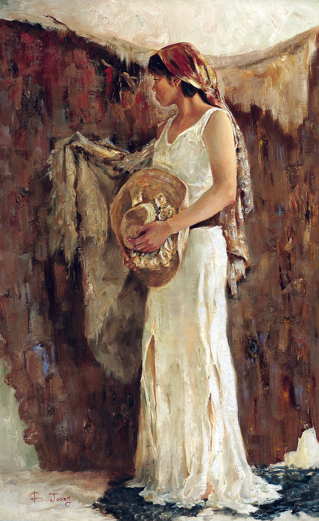 The woman in this painting seems like an echo from the past, a symbol of rural resilience and grace. The artist’s strokes are layered yet soft, weaving warmth into her attire, her hat, and the folds of the fabric she touches. It’s as if each stroke is a tribute to the land and its people, a pastoral narrative frozen in time. There’s a reverence in her gaze, a silent homage to the simplicity and depth of life lived close to the earth.