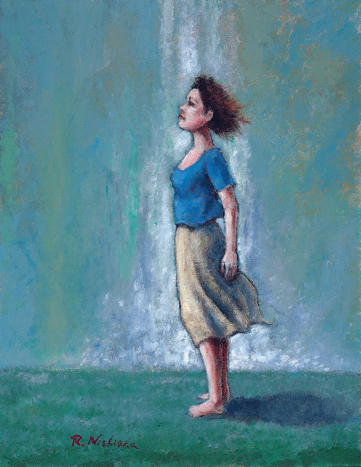 Stand Against the Wind captures a moment of serene resilience. Through soft, fluid strokes, the artist brings out the delicate play of movement, as the breeze tousles the hair and skirt of the woman standing with quiet strength. The gentle, feathered application of pastel colors evokes a feeling of ethereal weightlessness, almost as if she could float. The background, a blend of earthy tones, adds a contrast that grounds her figure. This artwork leaves one with a feeling of peace and a reminder of the beauty in steadfastness.