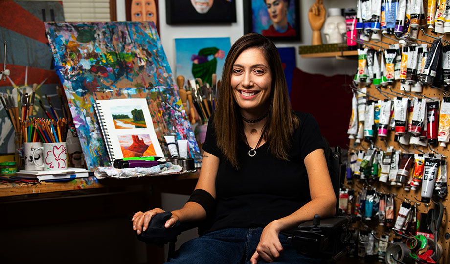 Mariam Paré was born in Morocco in 1975. As a young child she moved to the United States with her family. At the age of twenty she became the victim of gun violence which left her a quadriplegic. Before becoming injured, Mariam was an aspiring artist, studying Art. In a therapy session Mariam was taught to write her name by holding a pen with her mouth. She soon adapted this painting technique and enthusiastically began teaching herself to paint with her mouth. Today Mariam works on artwork with different subjects in traditional oil, acrylic and modern mixed-media techniques.