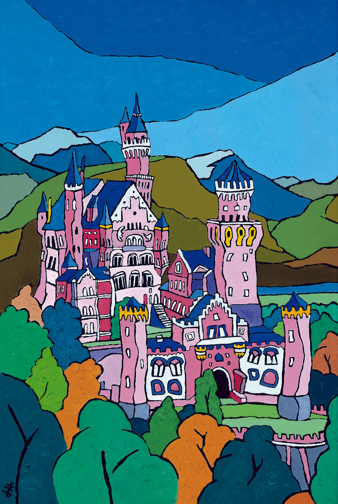 With a playful palette of pastel pinks, blues, and greens, this painting transports the viewer to the enchanting hills of Bavaria, capturing the magic of Neuschwanstein Castle. The style, with its simplified shapes and bright, almost childlike colors, evokes the wonder and awe often associated with fairy tales. The castle’s dreamlike presence on the canvas stirs up feelings of nostalgia and escapism, reminding us of childhood stories where anything is possible. The artist’s soft lines and bold color choices reflect a world where imagination reigns, offering viewers a chance to step into a landscape of wonder and magic.