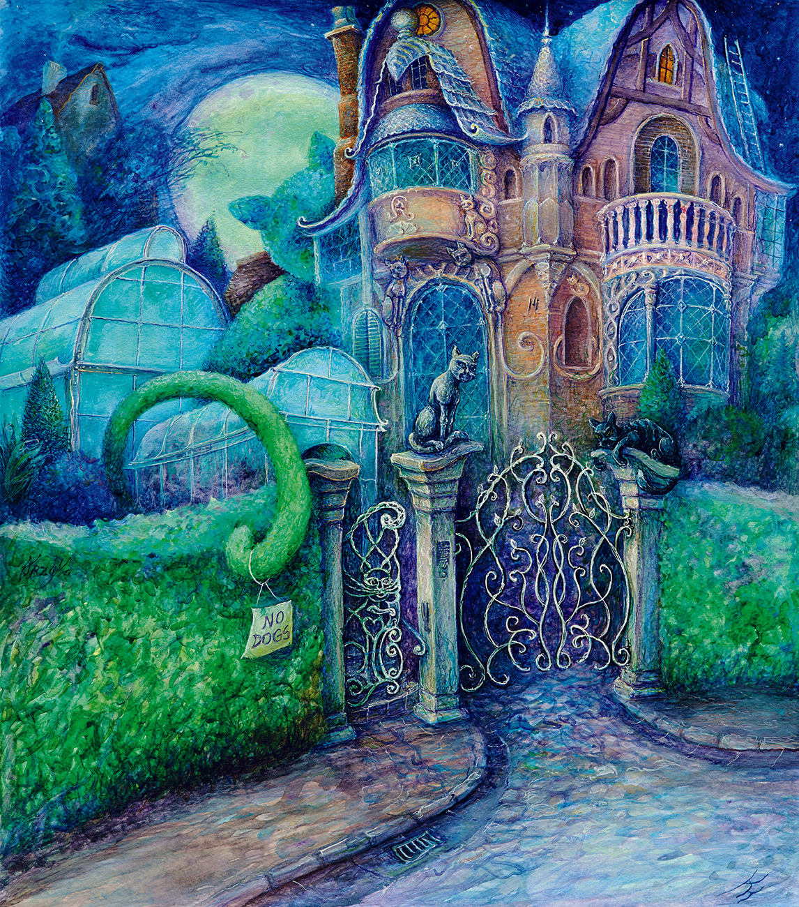 Wander into a world of mystery and fantasy through the 'The Enchanted Manor'. A fantastical mansion emerges under the light of a full moon, its intricate architecture and gothic details bringing to mind fairytales and myths. Cats sit atop the wrought-iron gates, keeping silent watch over a garden that seems alive with secrets and stories. The deep blues and purples lend the piece a dreamlike quality, drawing the viewer into a world suspended between reality and fantasy. The artist’s meticulous attention to detail evokes a sense of mystery, as though each element of the mansion holds a tale yet untold. This is a place where imagination roams free, inviting us to wonder at the mysteries hidden within.
