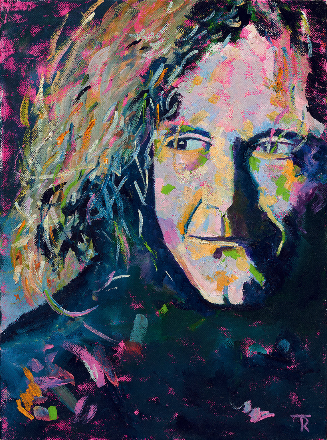 This electrifying portrait captures the essence of a celebrated figure—Robert Plant, the legendary front man of Led Zeppelin. The artist uses a blend of striking colors and expressive brushstrokes to reflect Plant’s powerful presence and musical charisma. With intense eyes looking off to the side, the image portrays both an introspective and enigmatic expression, drawing the viewer into the deeper complexities of his character. The juxtaposition of bright yellows, purples, and blues suggests a vibrant energy reminiscent of the dynamic rock era. The textured background, with splatters and dashes of pink, adds an atmosphere of movement and creativity, much like the music Plant is known for.