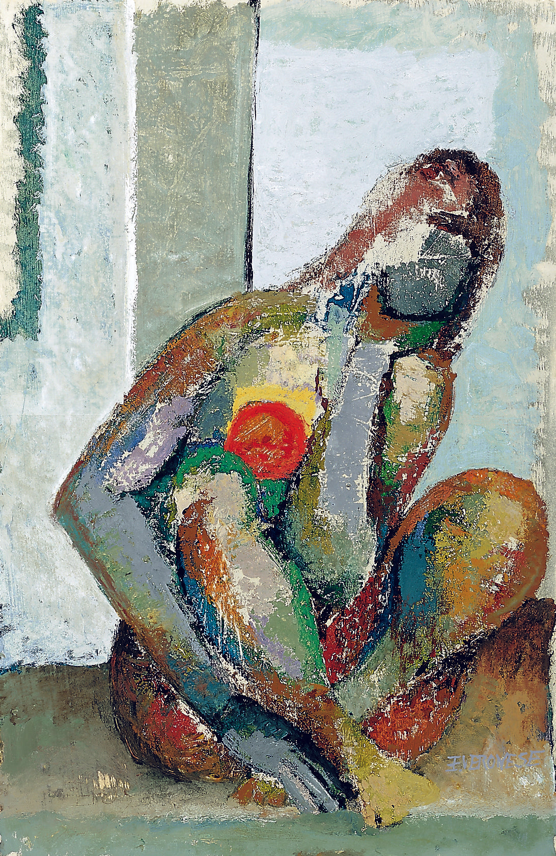A figure sits contemplatively, absorbed in introspection. The rough texture and expressive strokes echo the rawness of human emotion. With a subdued palette of earthy greens, muted oranges, and deep greys, the painting captures a moment of pause. The layering of colors speaks of complexity, while the figure’s posture hints at both vulnerability and strength, offering viewers a space for their own reflections.