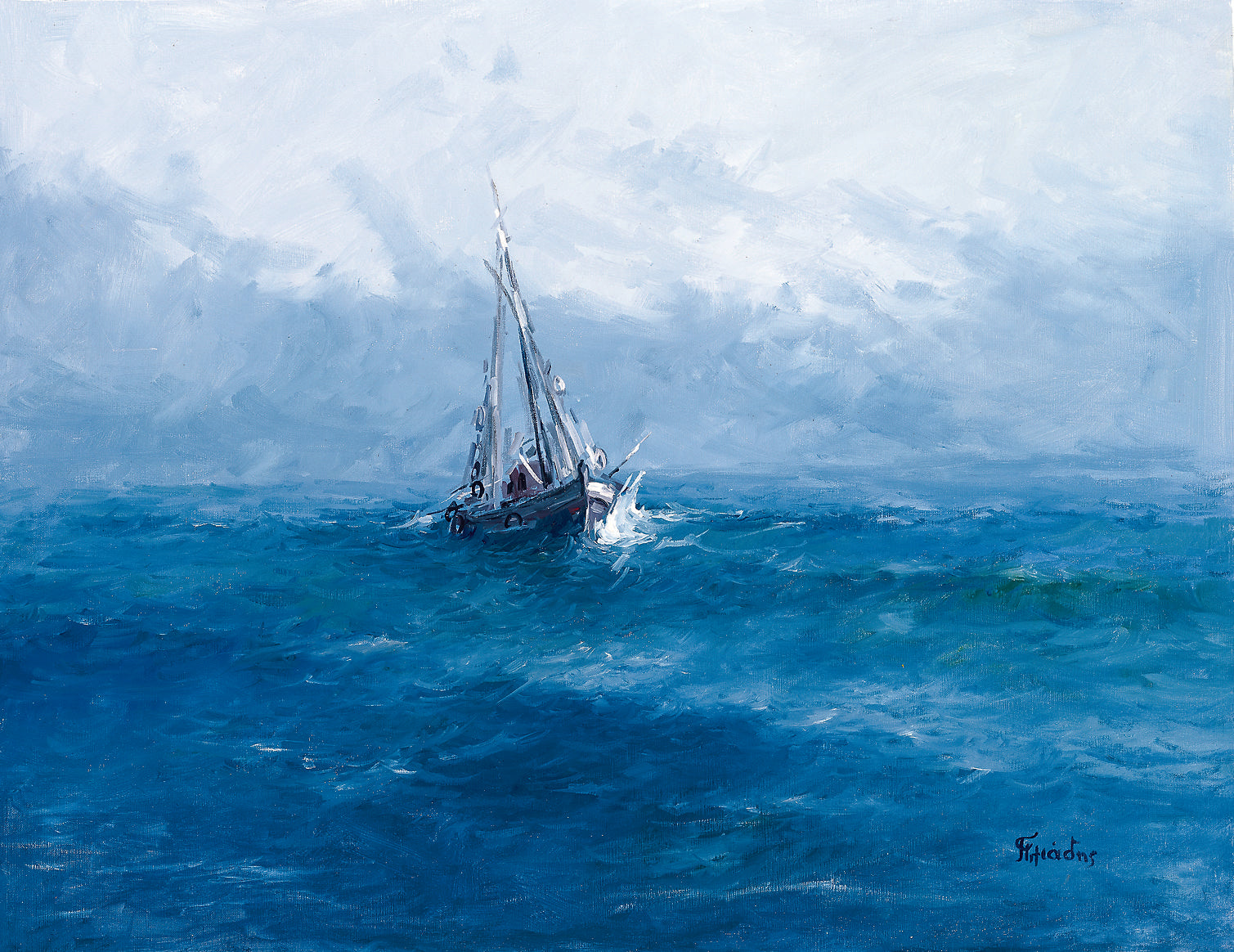 The power of the sea and the solitude of a single boat are encapsulated in this piece. The artist’s use of sweeping strokes gives the ocean a sense of endless movement, the waves pulling you in, as if you can feel the sea breeze on your skin. The boat, though small, doesn’t seem lost; rather, it is steadfast, navigating the vast waters with quiet resolve. There’s a strong connection between the viewer and this scene—perhaps a reminder of how we all navigate life’s boundless waters, sometimes alone but always moving forward.