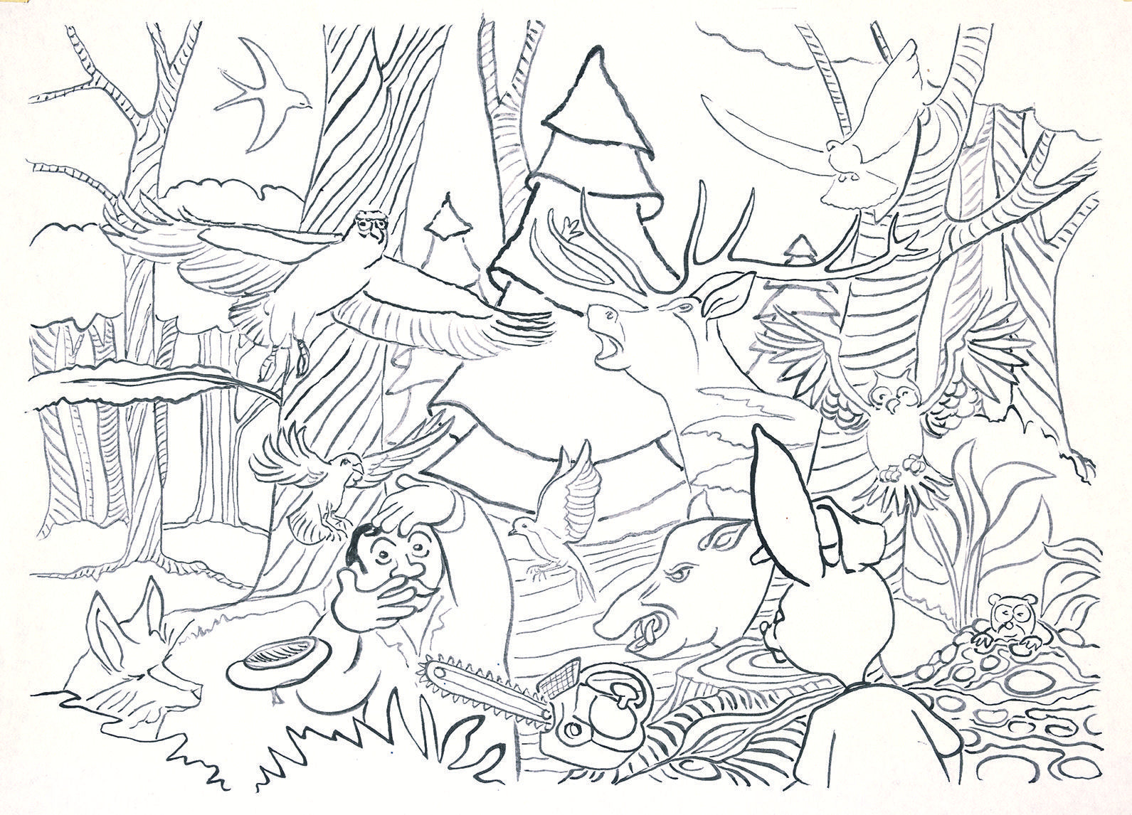 In "The Woodcutter's Hunt," the artist weaves an intricate scene of forest creatures caught in a delicate balance between curiosity and caution. Each animal—from the observant owl to the darting birds—seems aware of the woodcutter’s presence, portrayed with whimsical, flowing lines that give the forest an almost mythical quality. The woodcutter, deep in his task, appears both a part of and apart from this natural world, with animals carefully watching his every move. This drawing captures the essence of age-old interactions between humans and nature, evoking both the serenity of the woods and the quiet tension of the hunt.