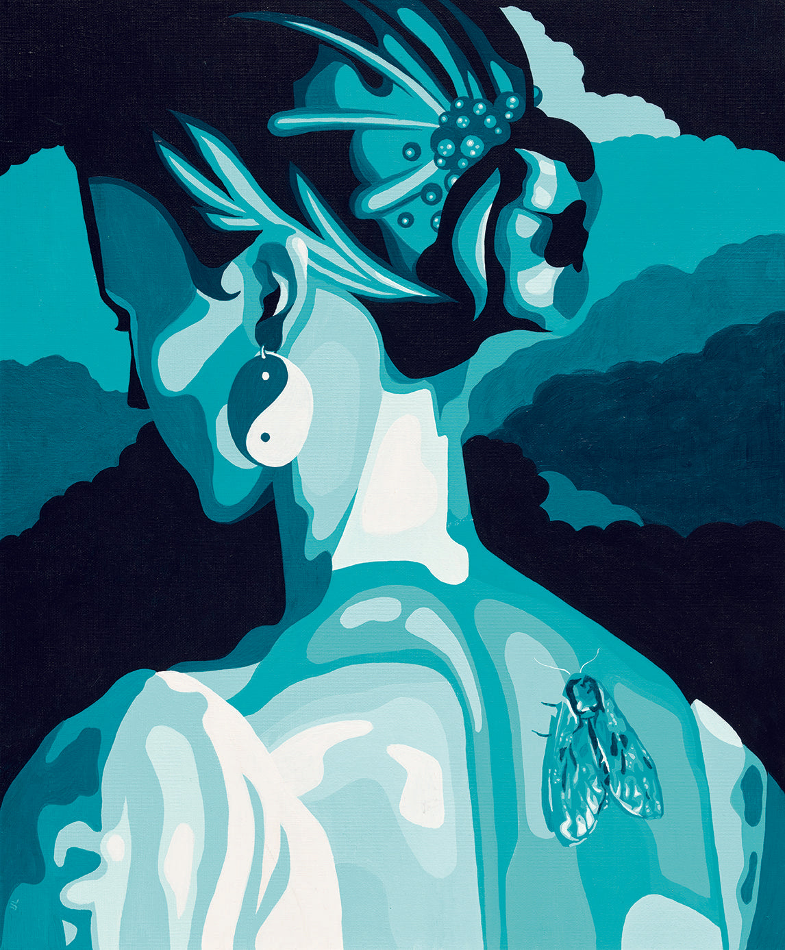 Rendered in soft, fluid shades of teal and turquoise, this piece is a quiet tribute to personal transformation. The artist’s minimalist style leaves space for the viewer’s emotions to fill the gaps, while the smooth, almost abstract contours of the figure suggest a blending of the physical and emotional realms. The cicada, detailed with precision, stands out against the ethereal backdrop as a symbol of renewal and inner strength. The contrast between the organic and the abstract speaks to the tension between stillness and change. The artist’s use of muted tones creates a reflective mood, drawing the viewer into a space of contemplation, where the cicada’s quiet presence becomes a metaphor for transformation—silent, yet inevitable.